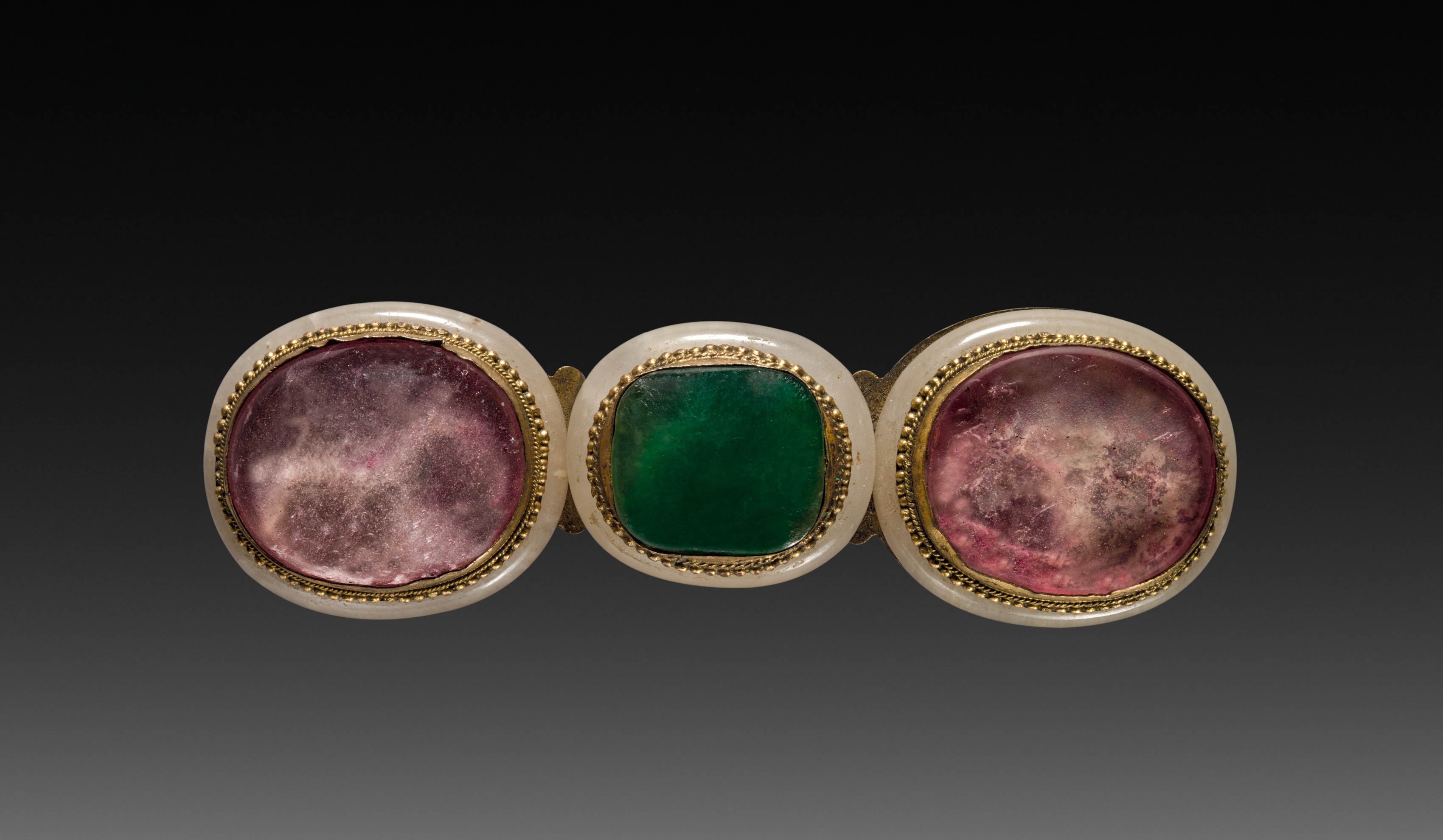 The buckle by artist Buckle features three large, rounded stones set in a gold-colored metal frame. The stones are arranged horizontally, with the left and right stones being circular and pinkish in color, while the center stone is square and green. Each stone has a gold beaded edge and is surrounded by a white border. The background of the image transitions from black at the top to dark gray at the bottom.