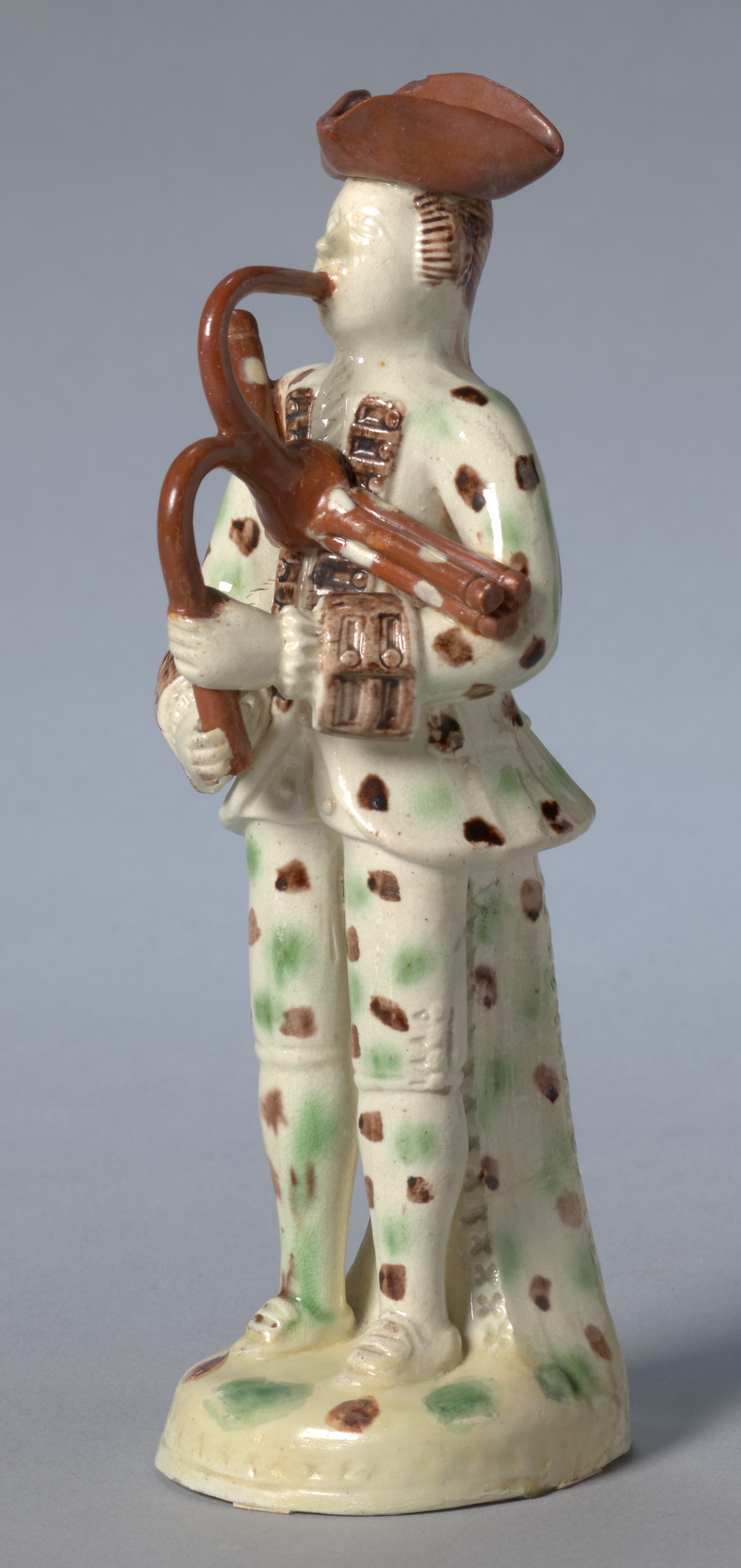The ceramic figure depicts a bagpiper. The figure stands on a small base and is dressed in a white tunic and pants with brown and green spots. He wears a brown hat and shoes. The figure is holding a brown bagpipe. The background of the image is gray.