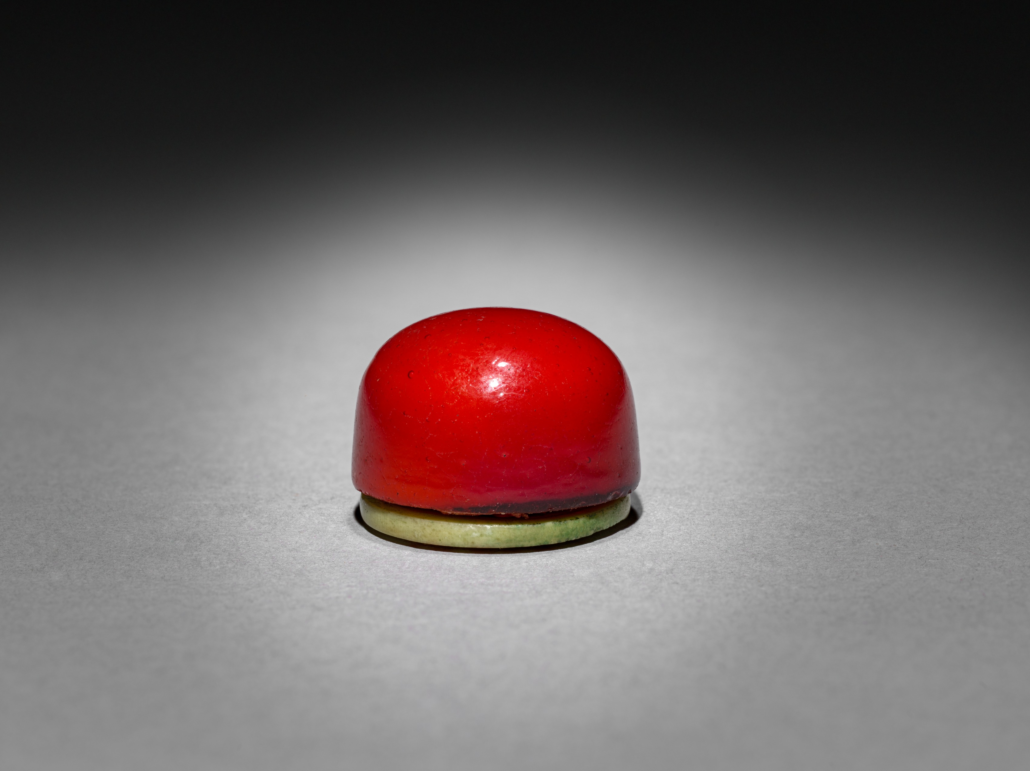 Red stopper with rounded top, green base; Snuff Bottle with Stopper by unknown artist.
