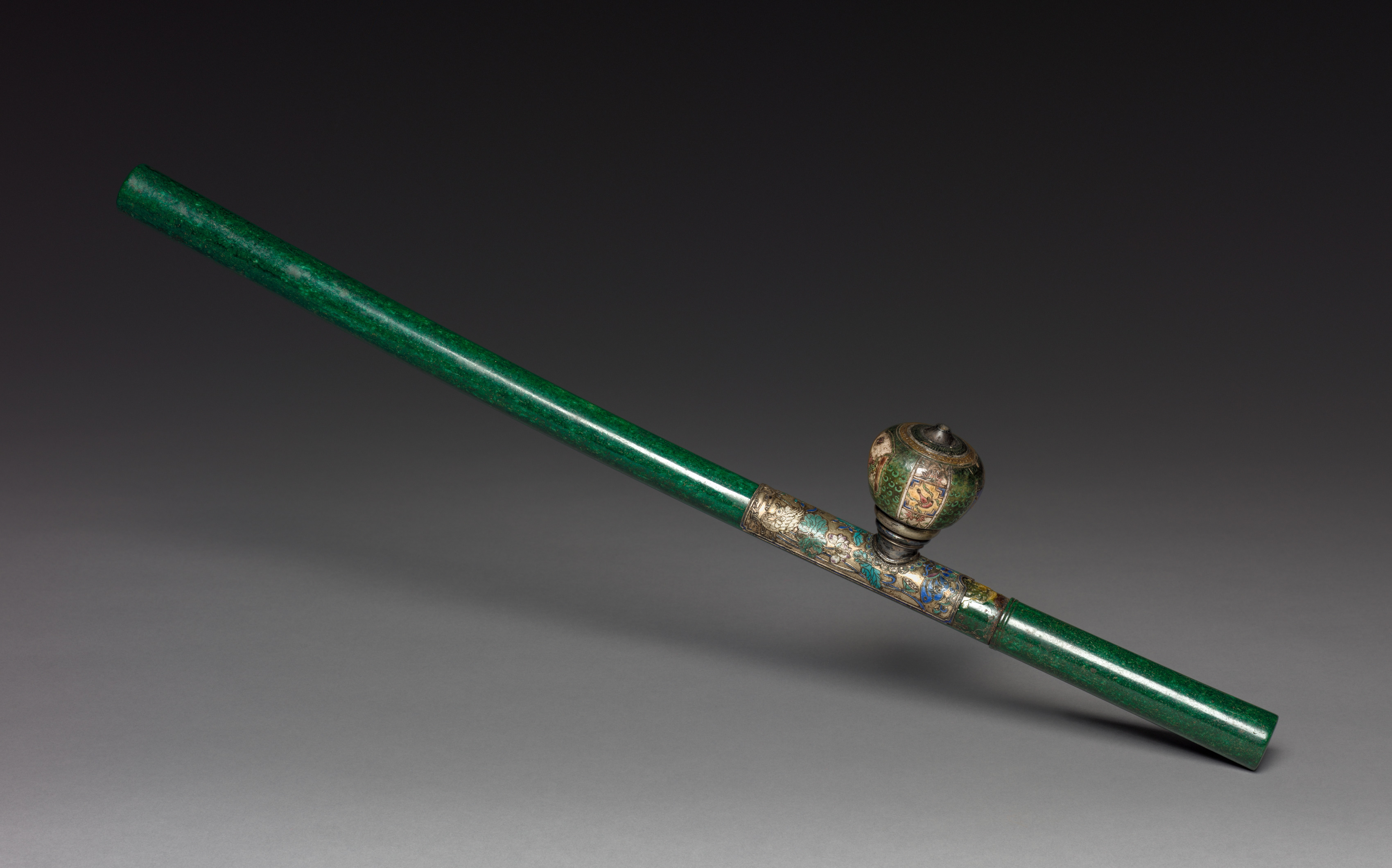 Green opium pipe by artist is titled Opium Pipe. Object has a long green stem. The bowl of the pipe is spherical and made of metal and features green enamel and gold decoration. The bowl is attached to the stem via a metal connector also decorated with green and gold. Background is dark gray to black gradient. Object lies diagonally across the image.