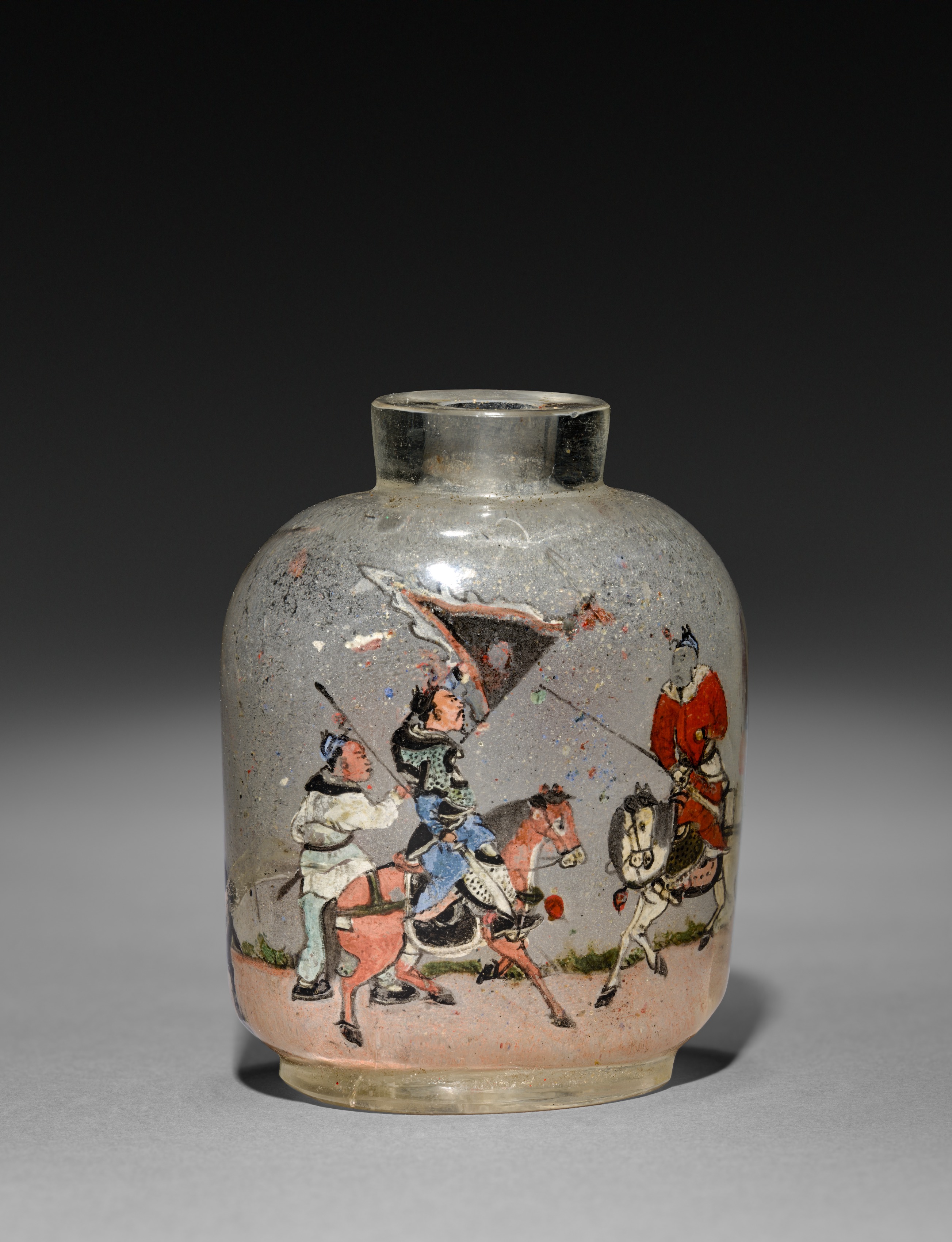 Snuff Bottle with Stopper by Unknown Artist. The bottle is a rounded, short-necked vessel with a small opening at the top. The bottle's body features a predominantly gray and pink color scheme, with a scene depicting several men on horseback and on foot, engaged in a battle or fight. One man on horseback wears a red robe and holds a spear. The men are dressed in various attire, including robes and tunics, and some wield weapons like spears and swords. The background of the scene is minimal, with some greenery at the bottom. The overall appearance of the bottle is one of aged, weathered ceramic material. The stopper is not visible in the image. The bottle is set against a dark background that gradually lightens towards the bottom.
