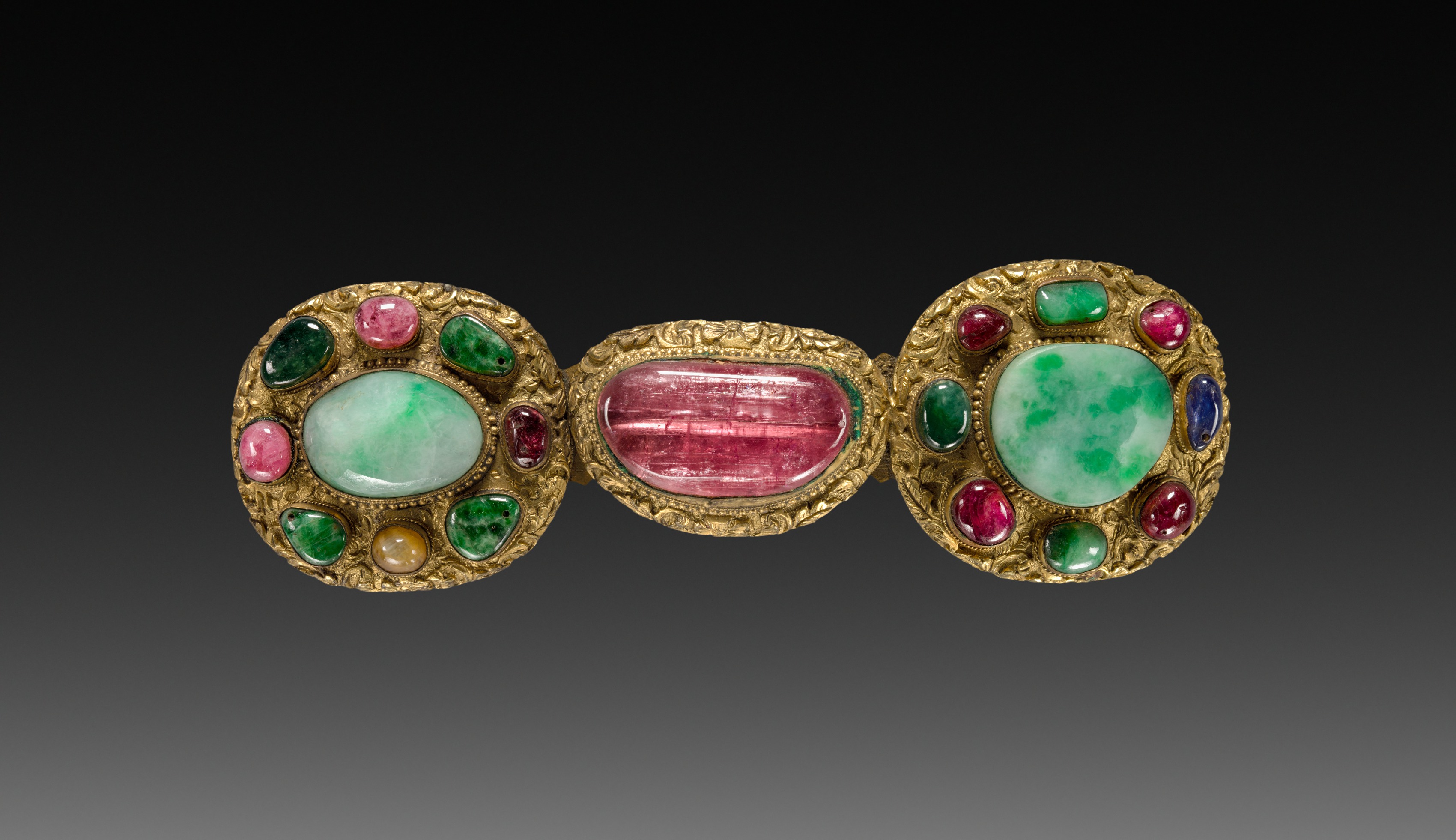 Gold buckle with three sections. The left and right sections are round, with a large oval stone in the center of each. The left center stone is white with green streaks. The right center stone is green with green streaks. Both round sections have a border of small oval and round stones in various colors, including pink, green, dark red, and brown. The middle section is oval and contains a large pink stone with horizontal striations. The background of the image is dark gray to black, with a white border on the right side.