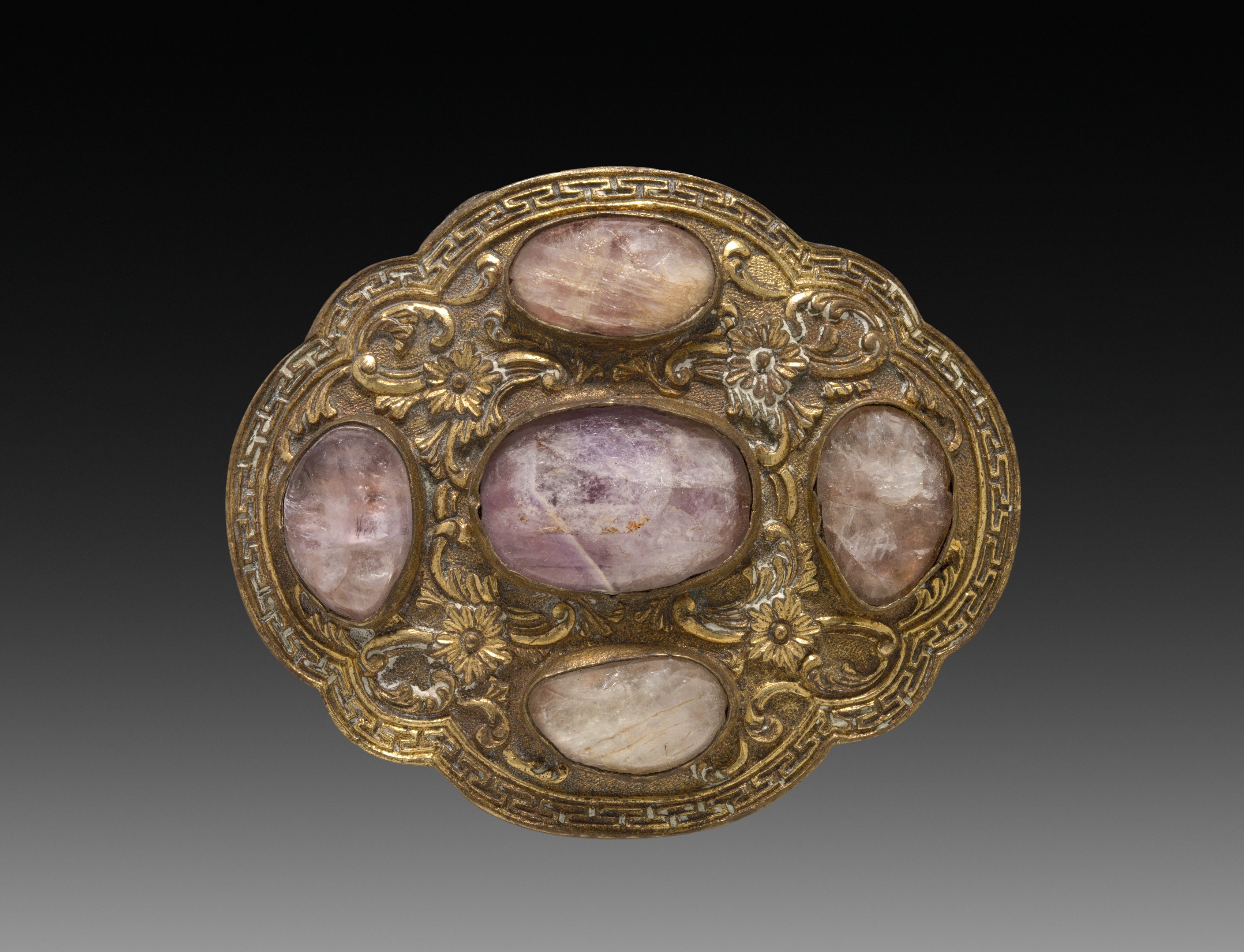 Gold-colored brooch with a scalloped edge. The brooch has a Greek key pattern around the edge. There are five oval stones set into the brooch. The stones are light purple and white with a marbled appearance. The stones are surrounded by floral patterns. The background is black at the top and fades to gray at the bottom. "Buckle" by artist unknown.