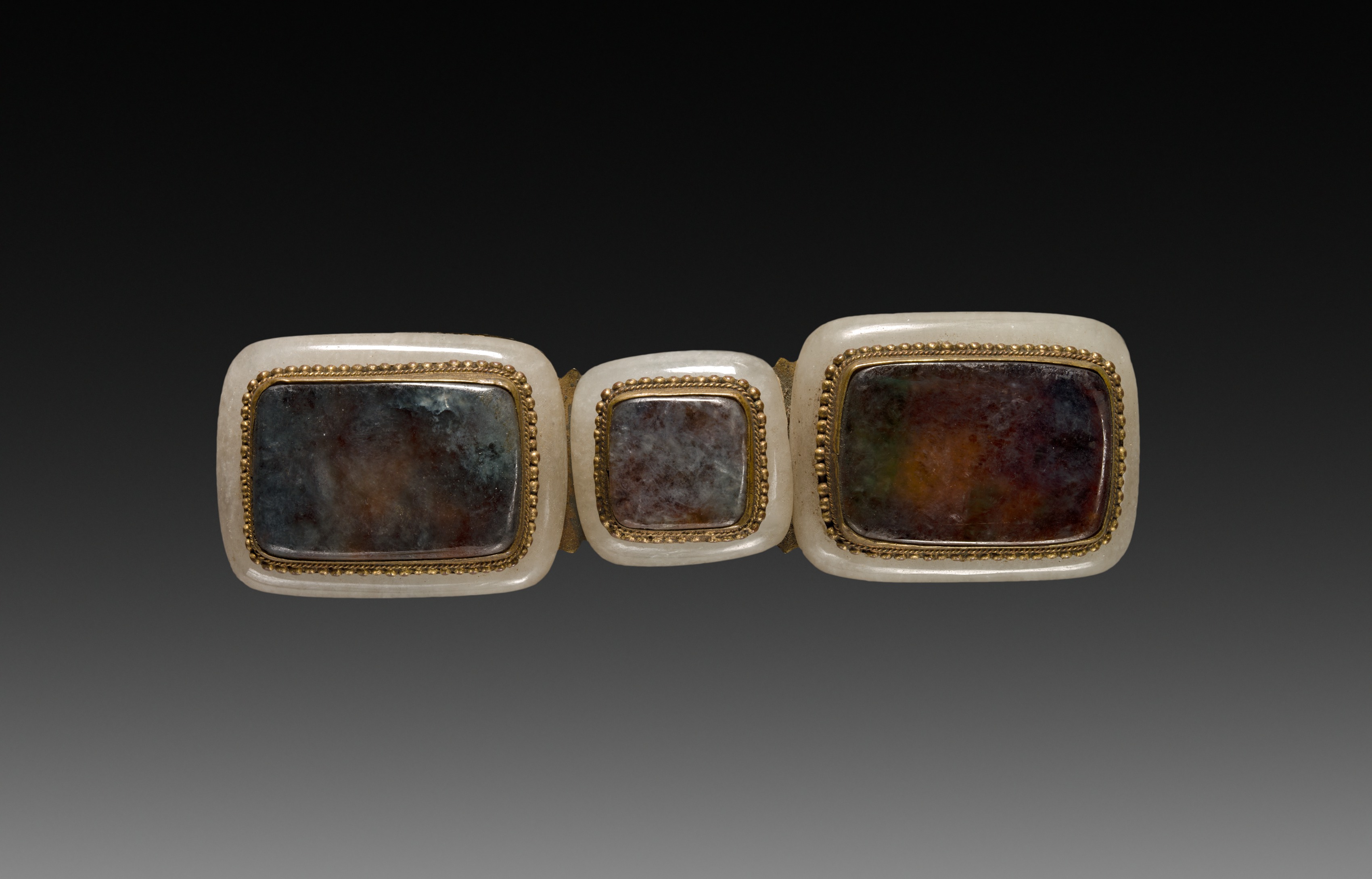 The title of the image is "Buckle" by artist unknown. Three square-shaped objects are arranged horizontally. The objects have rounded corners and a white border around each one. Each object has a gold rope-like border around the inner part. The inner part of each object appears to be a dark-colored stone with shades of brown, gray, and black. The stones are not uniform in color and have a marbled appearance. The object on the left is larger than the one in the middle, and the object on the right is the same size as the one on the left. The background of the image is black at the top and fades into gray at the bottom.