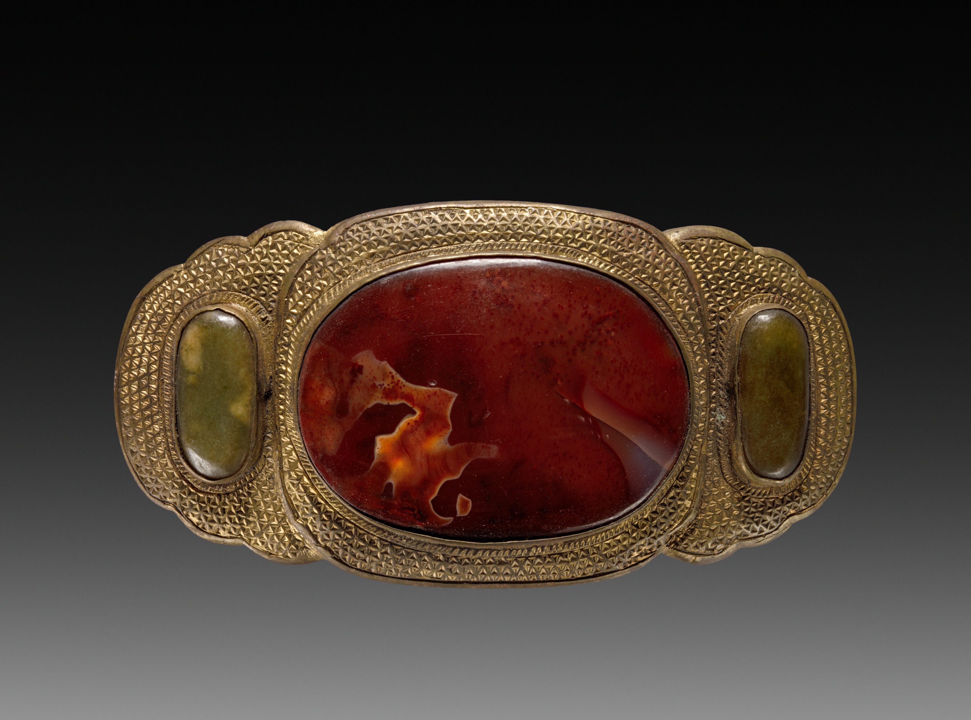 Gold-colored metal buckle with a textured surface, featuring a large oval red stone with brown and yellow marbling in the center, and two smaller oval greenish-gold stones on either side; the buckle has a scalloped edge and a gradient background transitioning from black at the top to gray at the bottom. Artist: Louis Comfort Tiffany Title: Buckle