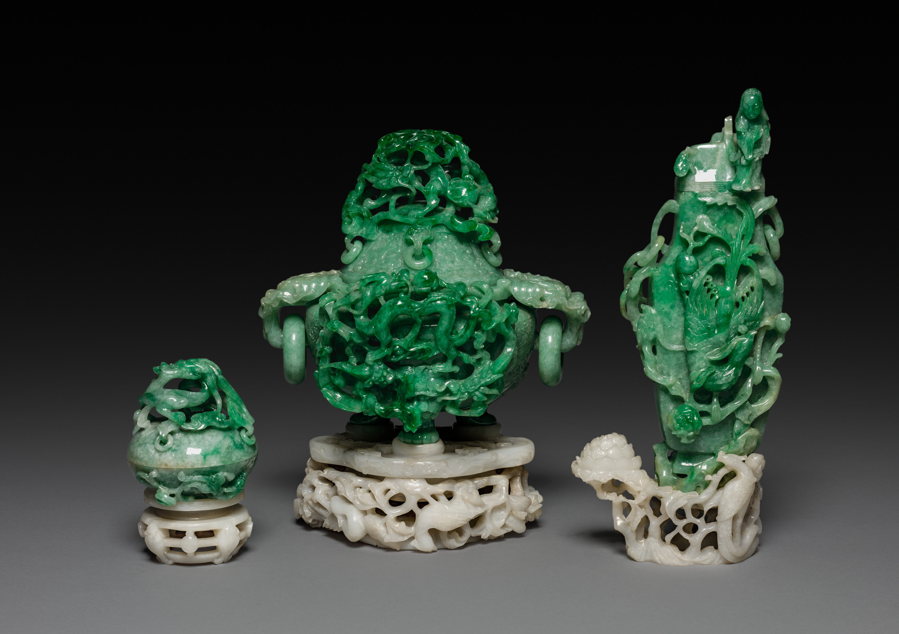 The image depicts a "Three-Sectional Altar Group" by an unknown artist. Three green and white jade pieces are shown. The leftmost piece is a small, rounded jade object with a dragon design on top of a white jade stand. The middle piece is a large, rounded jade object with a dragon design on top and sides, sitting on a white jade stand. The rightmost piece is a tall, thin jade object with a dragon design and a figure on top, sitting on a white jade stand. The background is black at the top and fades to gray at the bottom.