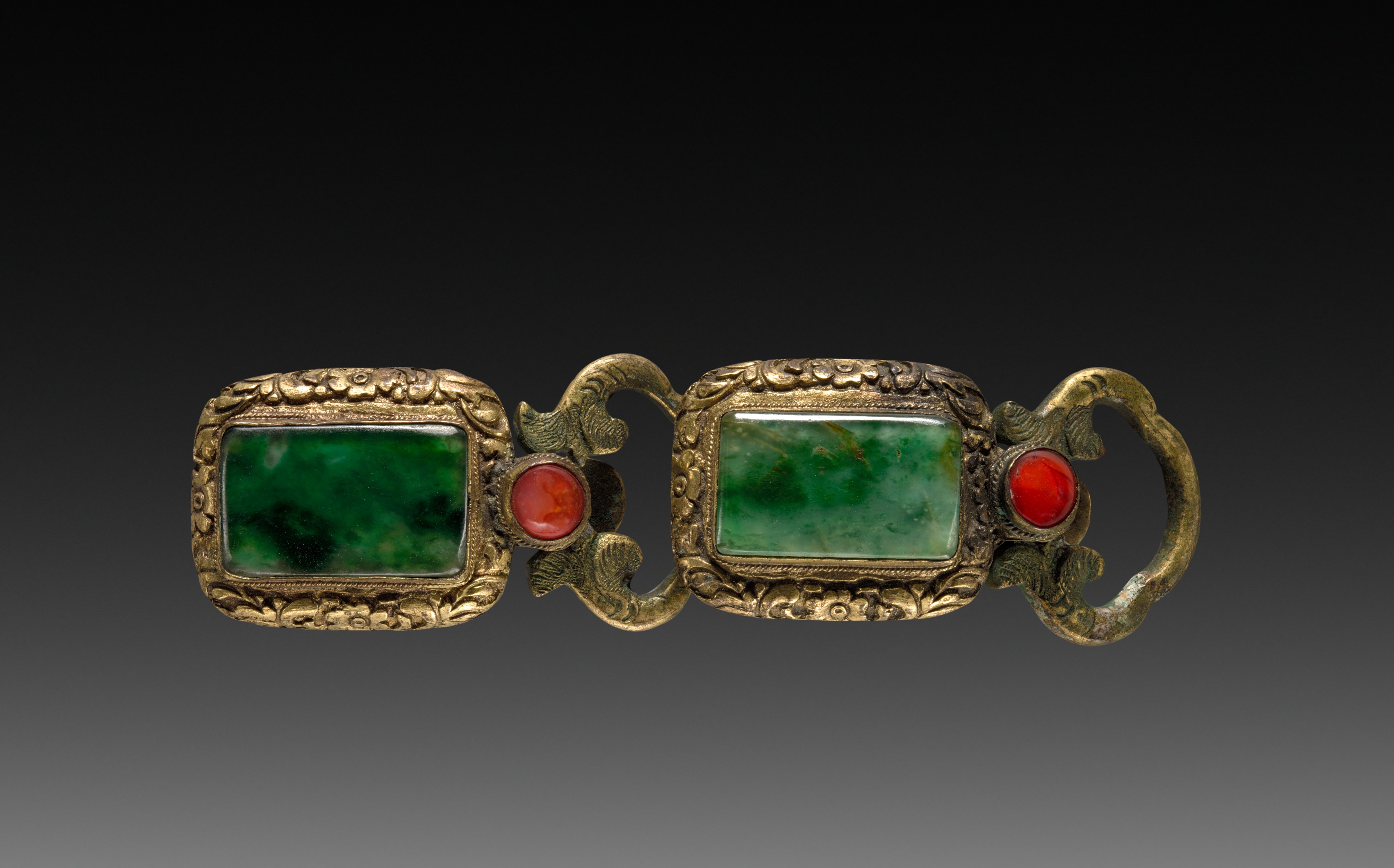 Gold bracelet with two rectangular green jade stones and two round red stones, featuring ornate floral designs and curved leaf-shaped links. The bracelet has a hinged design, with a small loop at one end. The background is dark gray to black gradient. "Buckle" by artist not provided in context.