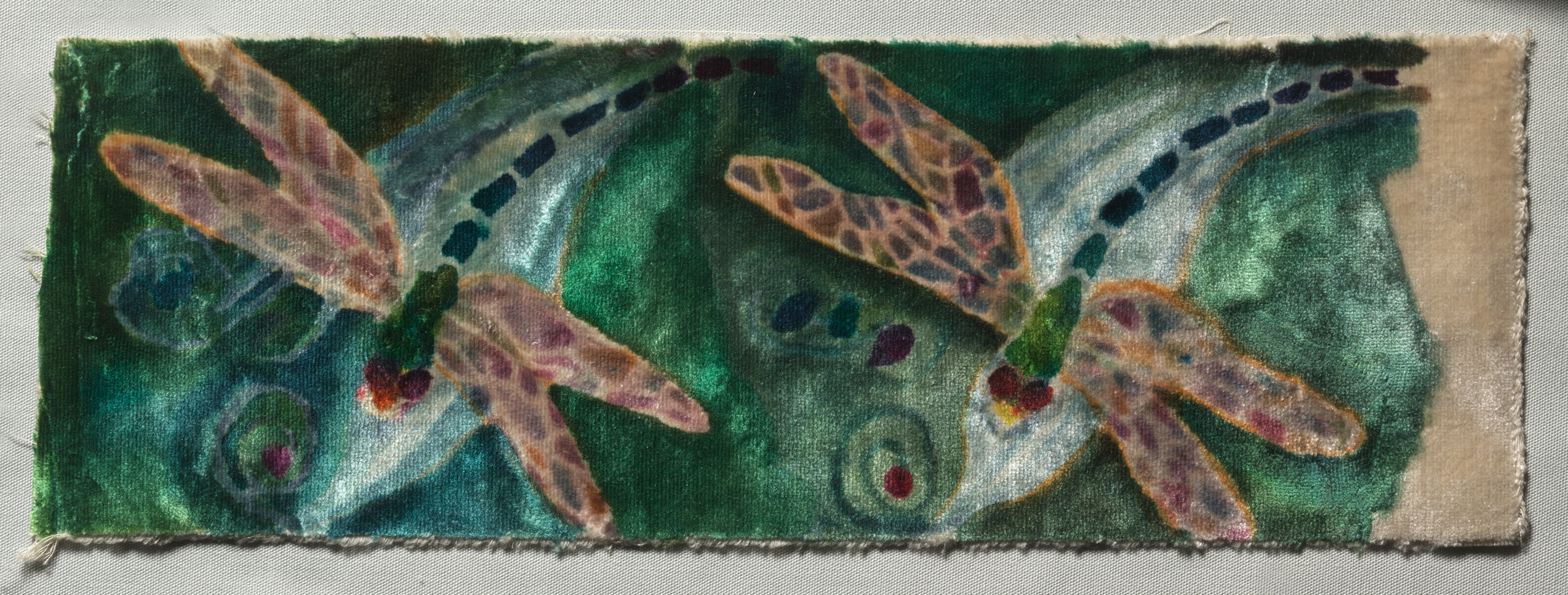 Rectangular velvet artwork with frayed edges, featuring three dragonflies against a green background. The dragonflies have light-brown bodies with darker spots and red eyes. The background has swirling patterns and spots in shades of green, blue, and purple. The artwork appears to be stenciled. The title is "Stenciled Velvet" and the artist is Tiffany Studios.