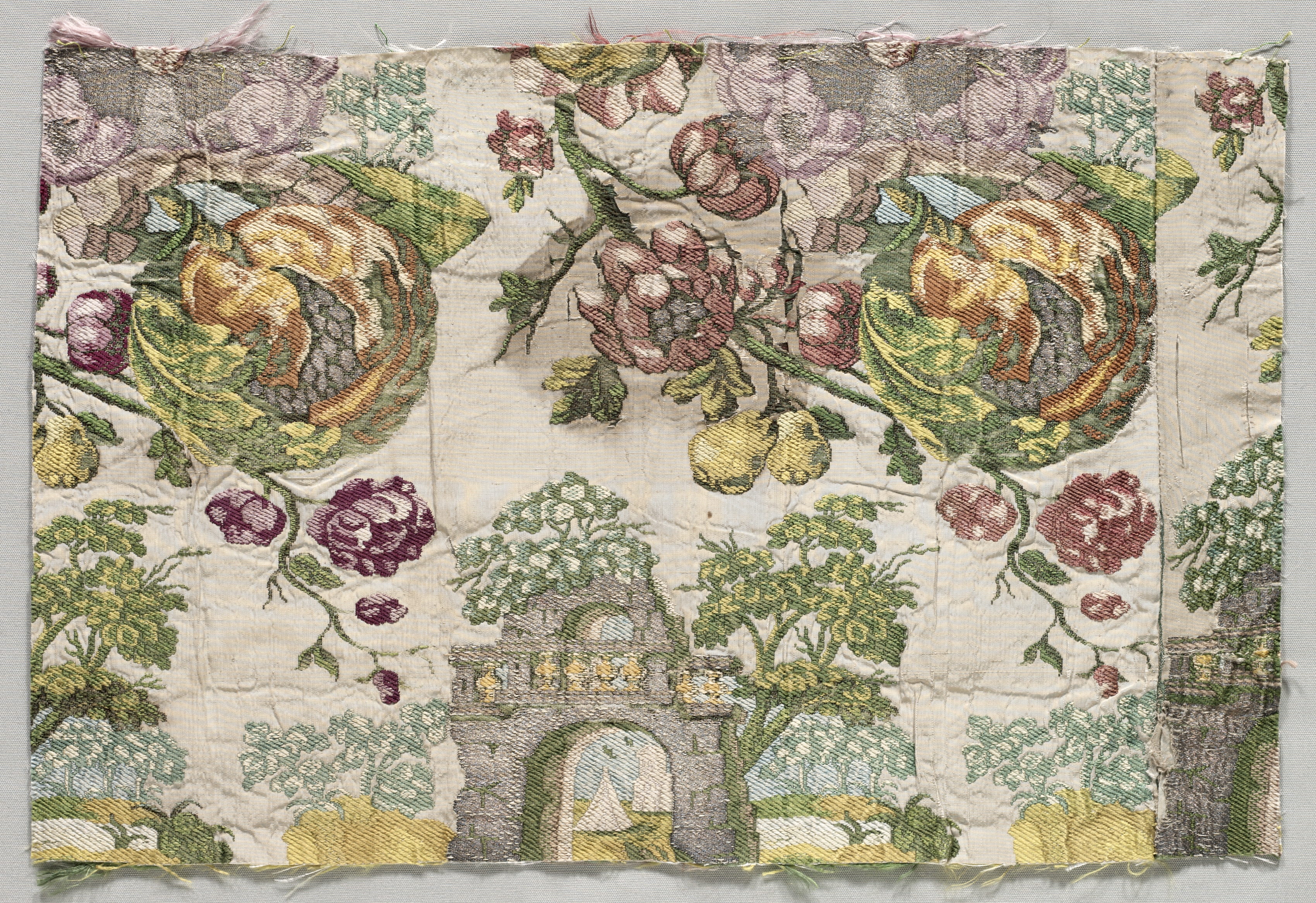 The Brocaded Textile by Unknown Artist depicts a square piece of fabric with a floral pattern. The fabric features a cream-colored background with a repeating design of colorful flowers, leaves, and trees in shades of green, yellow, purple, and brown. Two circular designs resembling peacocks or birds are positioned at the top, surrounded by flowers and foliage. Below the birds, an archway with a tree growing through it and a stone structure is visible. The edges of the fabric are frayed and rough. The fabric appears to be made of a thick, woven material with visible texture. The overall design is intricate and ornate, suggesting it may be a piece of decorative textile. The fabric is set against a light gray background. The image presents a close-up view of the fabric, showcasing its detailed pattern and texture.