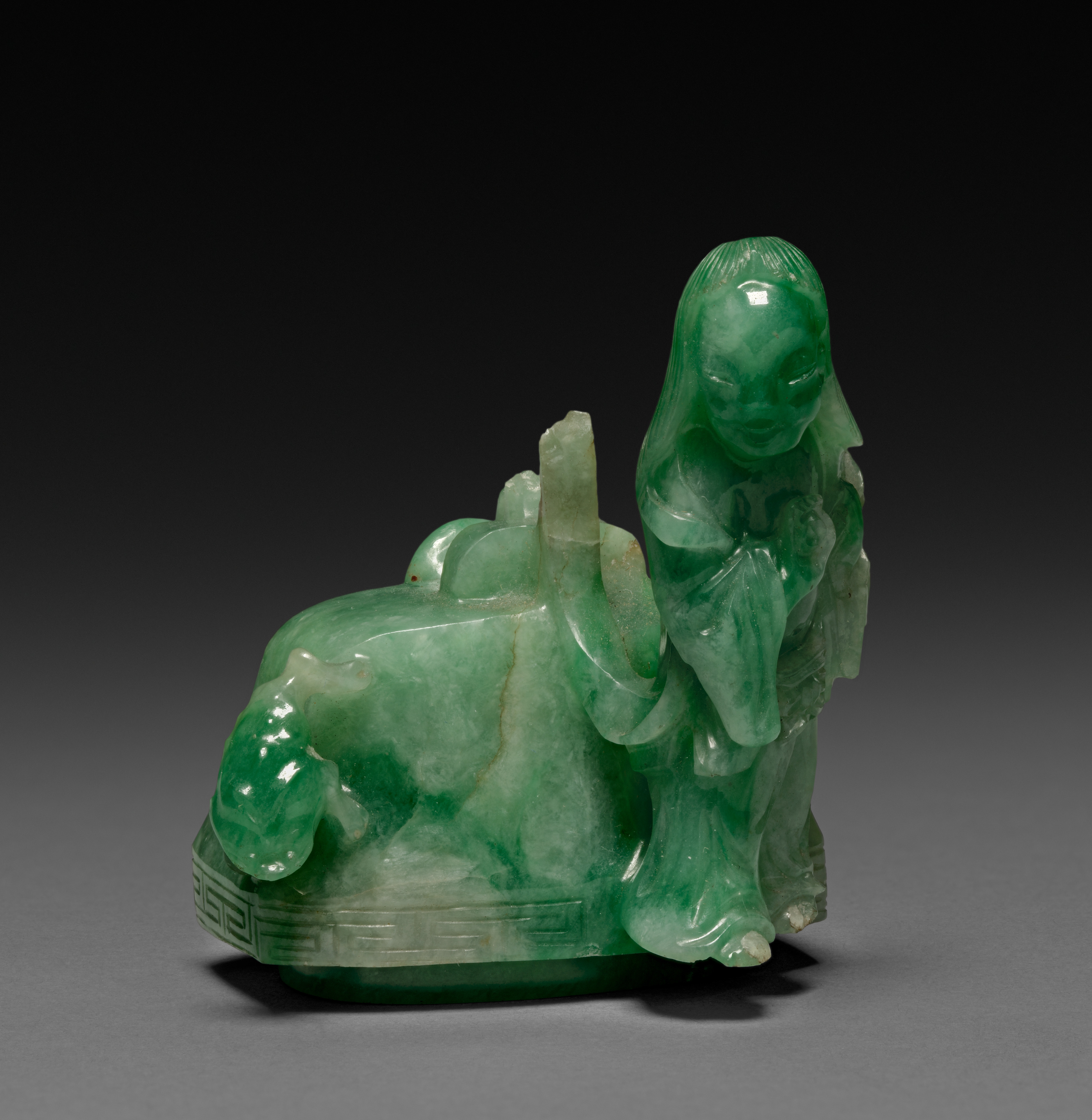 Three-Sectional Altar Group: Cylindrical Carving with Phoenix (lid) by artist. Green jade sculpture of a girl and a recumbent animal. The girl stands on the right side of the animal, wearing a long dress. Her left hand touches her chest and her right-hand holds an object. The girl has long hair and her facial features are carved simply. The recumbent animal lies on its side with its head on the left. The animal's body features a geometric pattern around its middle section. The animal's head features a protrusion on top and a curved beak-like mouth. A green jade cylindrical object rests on top of the animal's back. The background is dark gray to black, and the sculpture casts a shadow on the surface below.