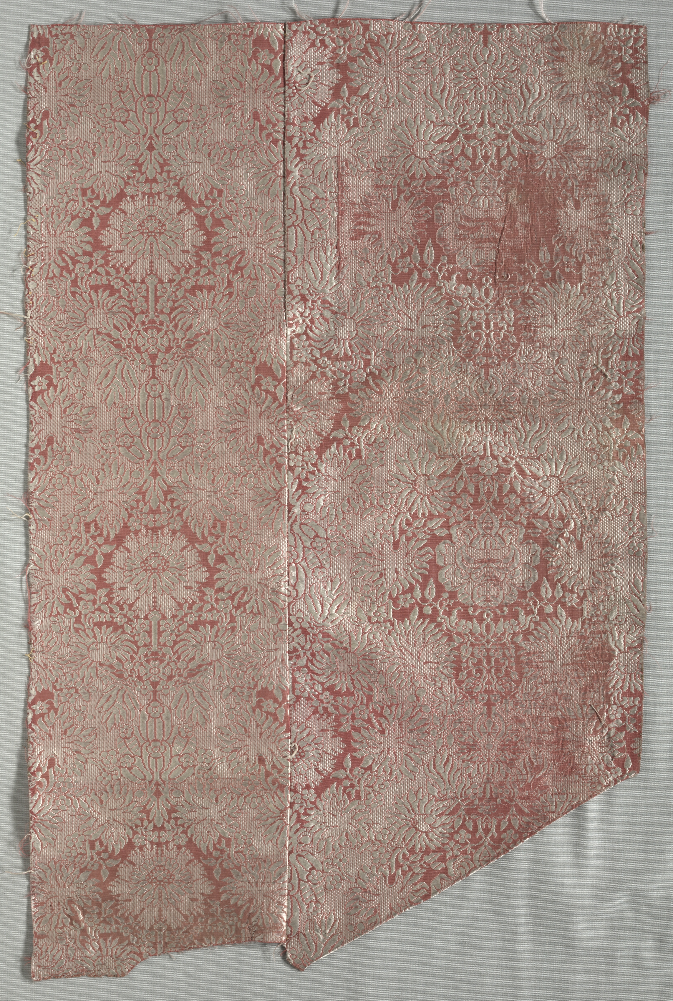 The image shows a piece of pink and gold silk textile titled "Silk Textile". The textile is rectangular with a pink background and gold floral patterns. The fabric has a shiny appearance. The right bottom corner of the fabric is folded over. The edges of the fabric are frayed. The background behind the fabric is light gray.