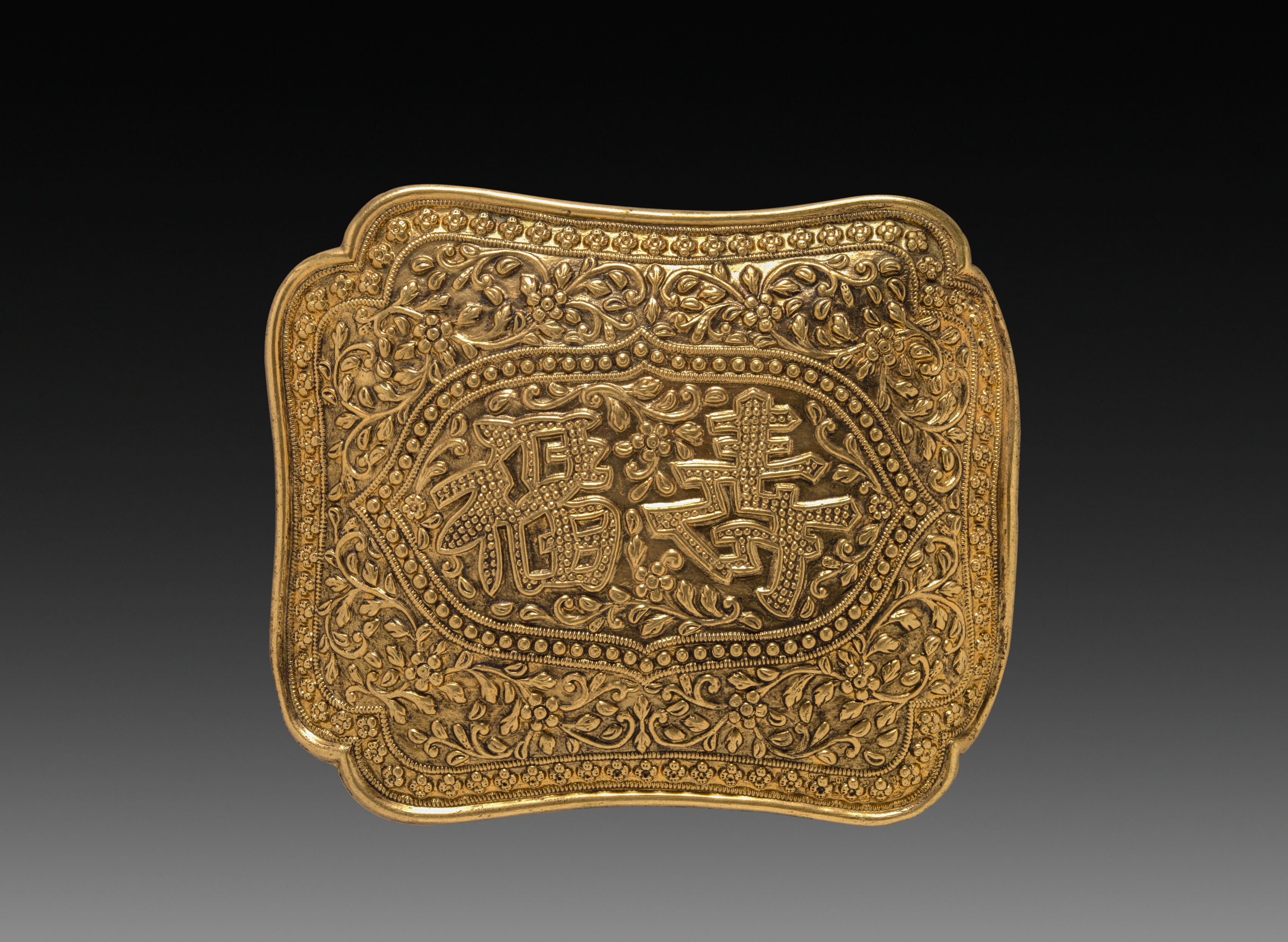 The image shows a gold-colored metal object with rounded corners and wavy edges, resembling a buckle. The object has an intricate design featuring a central raised rectangle with curved edges, containing Chinese characters in a textured, raised pattern. The background of the central rectangle features a floral design. The object is surrounded by a border of small dots and a floral pattern. The background of the image transitions from black at the top to gray at the bottom. The object appears to be titled "Buckle", created by an unmentioned artist.