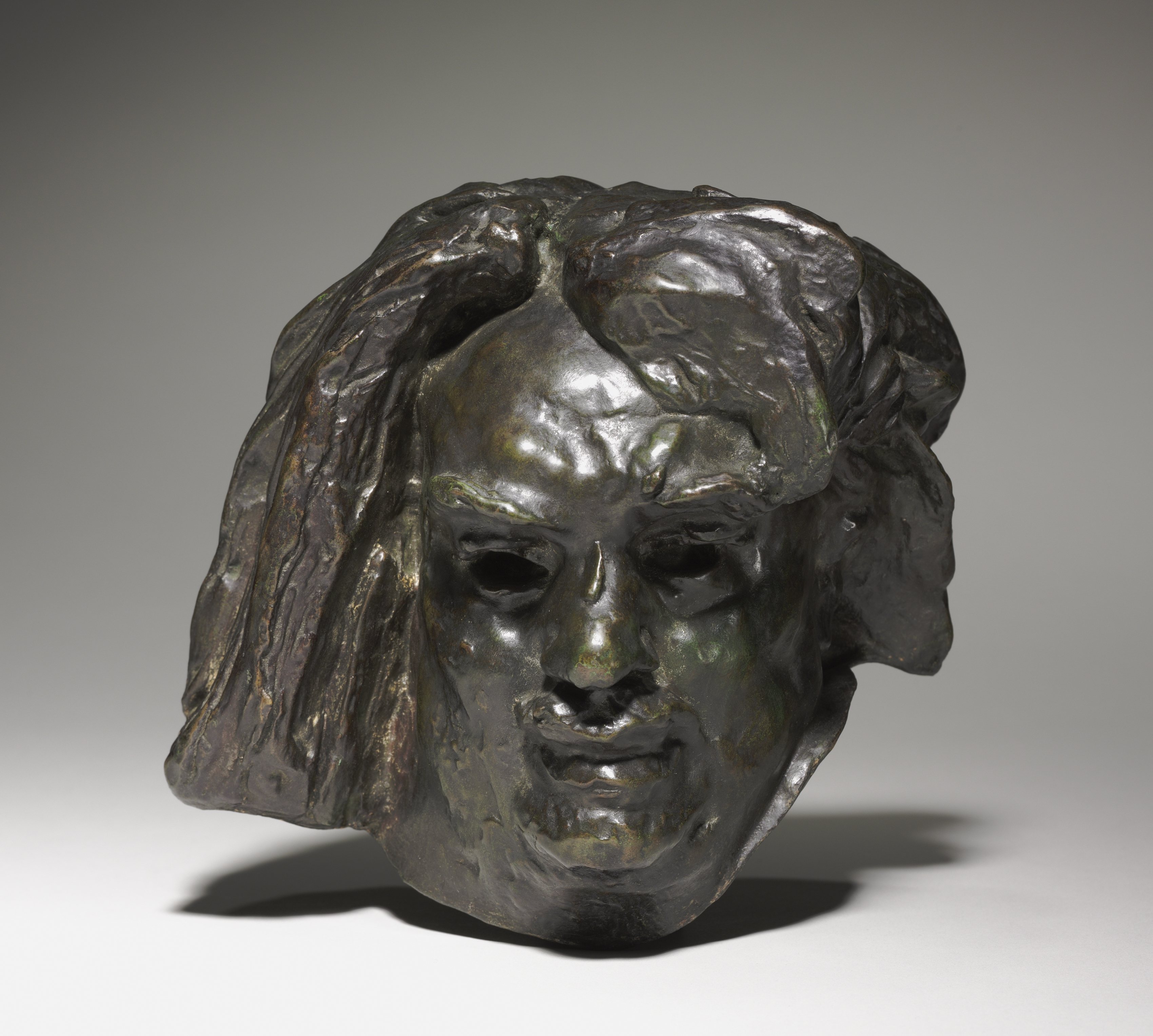 Dark bronze sculpture of a head with long hair; head facing forward; facial expression intense; mouth slightly open; eyes indented; nose and mouth defined; long hair on both sides of head; background gray with shadow underneath.
