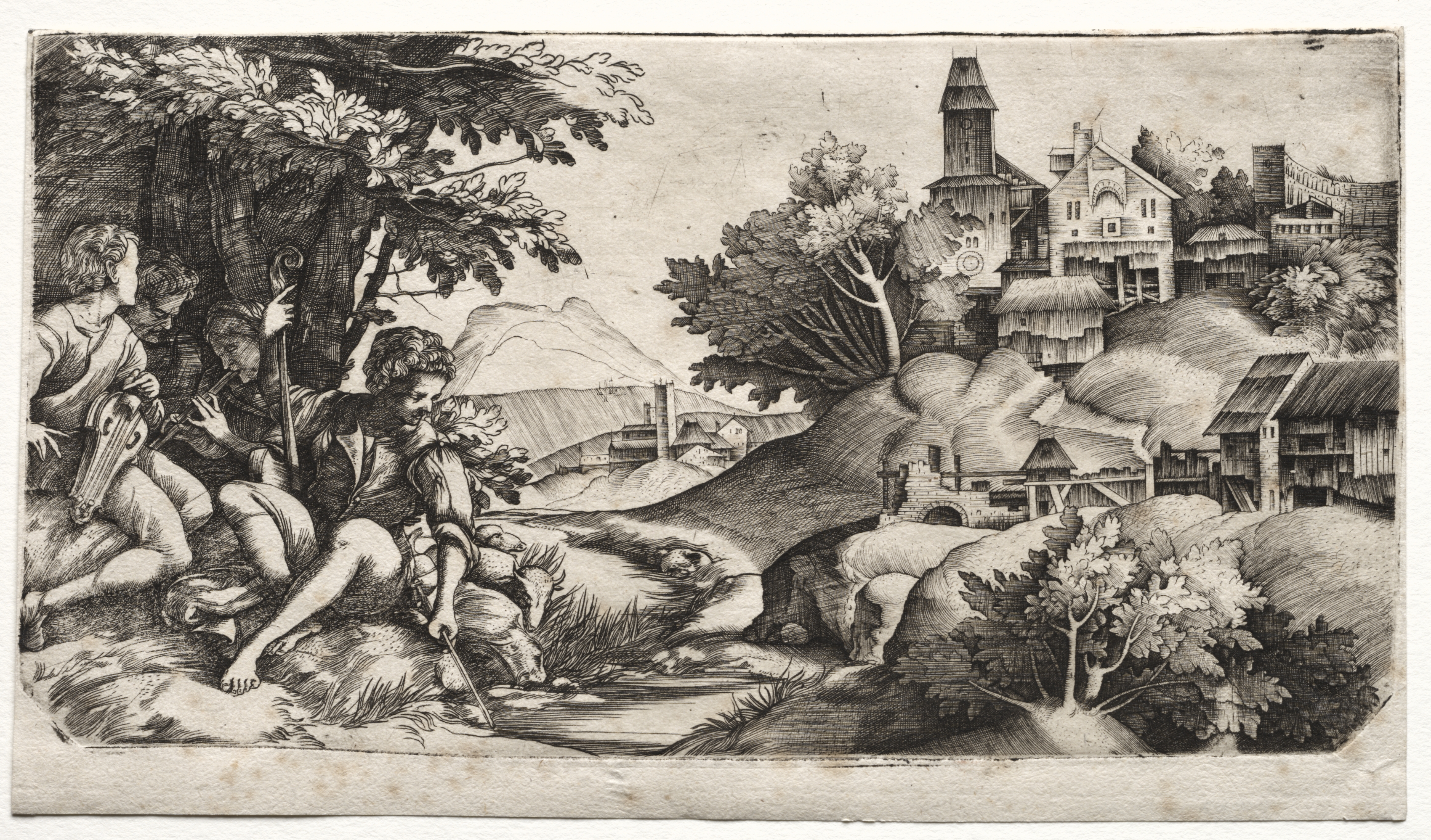 The image depicts a black and white landscape drawing titled "Shepherds in a Landscape" by Giulio Campagnola. The scene shows a group of people on the left side, with one playing a stringed instrument and two others to their right; one of them is leaning forward. The group appears to be situated on a grassy slope. Behind them is a tree and a distant mountain range. On the right side of the image, there are several buildings on a hillside, including what appears to be a church or tower. The buildings have thatched roofs and are surrounded by trees and bushes. The overall atmosphere suggests a pastoral or rural setting. The image is rendered in detailed, cross-hatching lines.