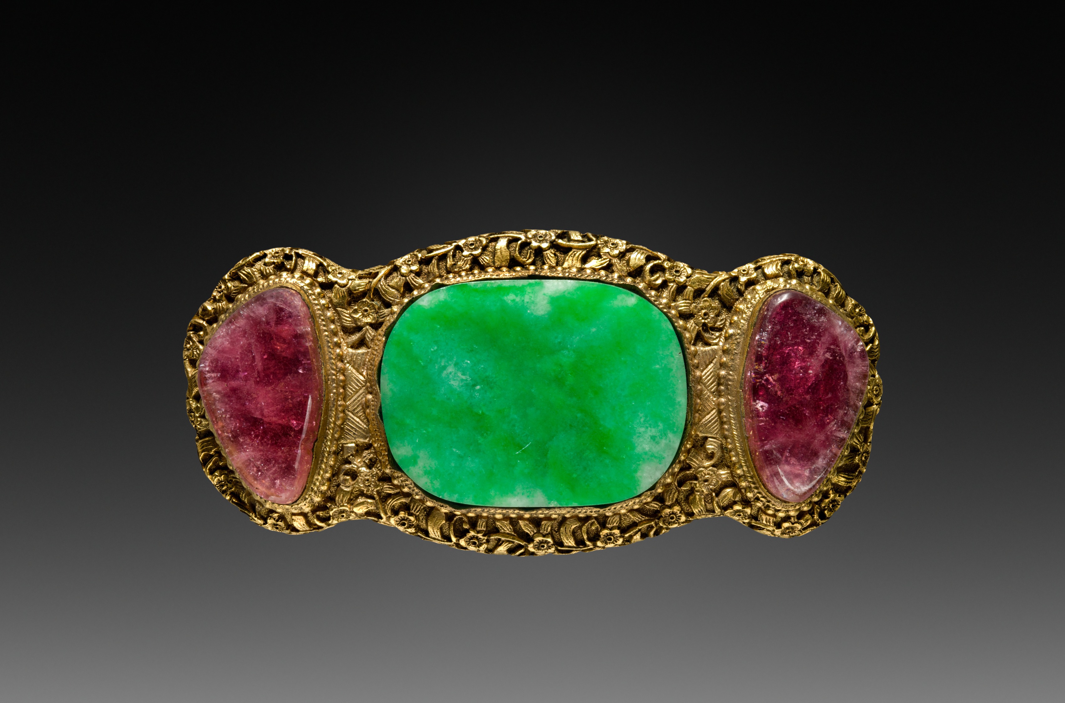 Gold bracelet with a central rectangular green stone, and two oval pink stones on either side. The bracelet is set against a black to grey gradient background. The gold bracelet has an ornate design. The central stone is green and rectangular with rounded corners. The two stones on either side are pink and oval-shaped. The bracelet is titled "Buckle" by the artist.