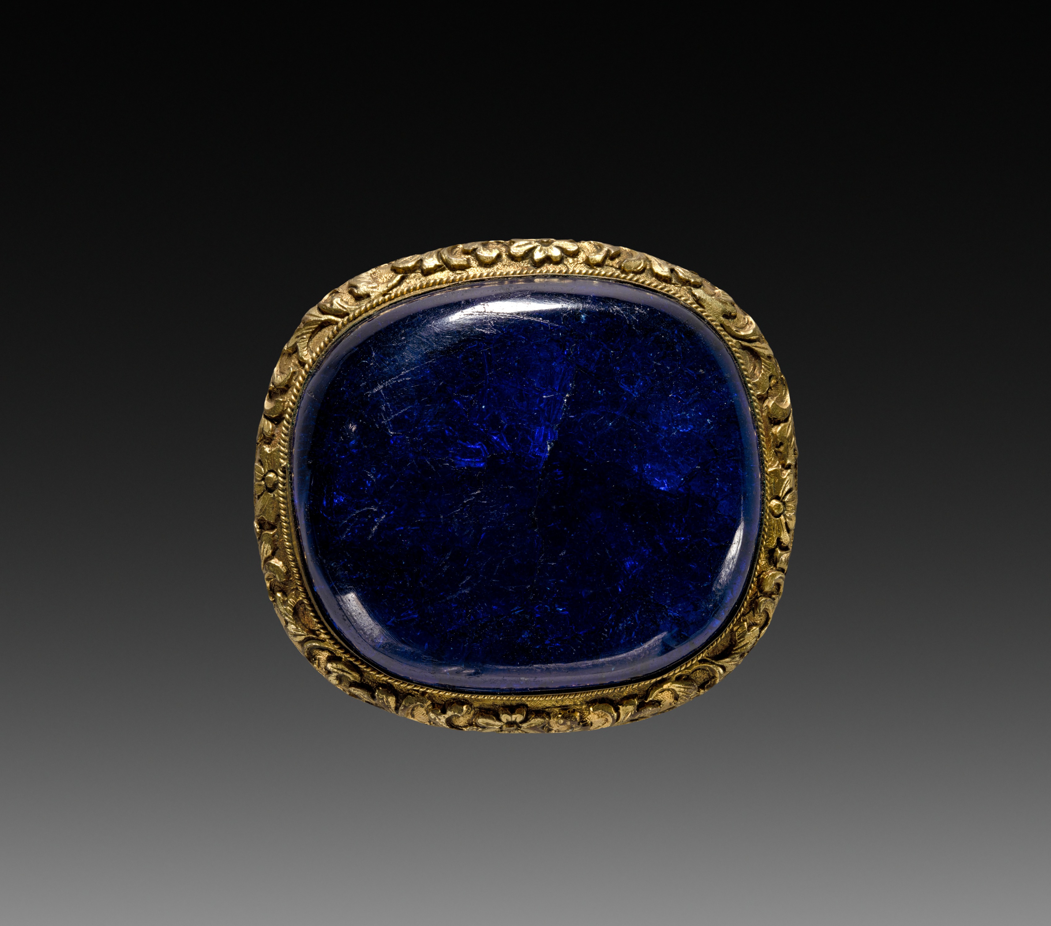 Large, rounded square gold buckle with a deep blue stone. The stone is dark blue with lighter blue marbling. The gold frame has intricate etchings resembling flowers or leaves around the perimeter. A rope-like design borders the inner edge of the frame. The background is black at the top fading to gray at the bottom. The buckle appears to be titled "Buckle" by an unknown artist.