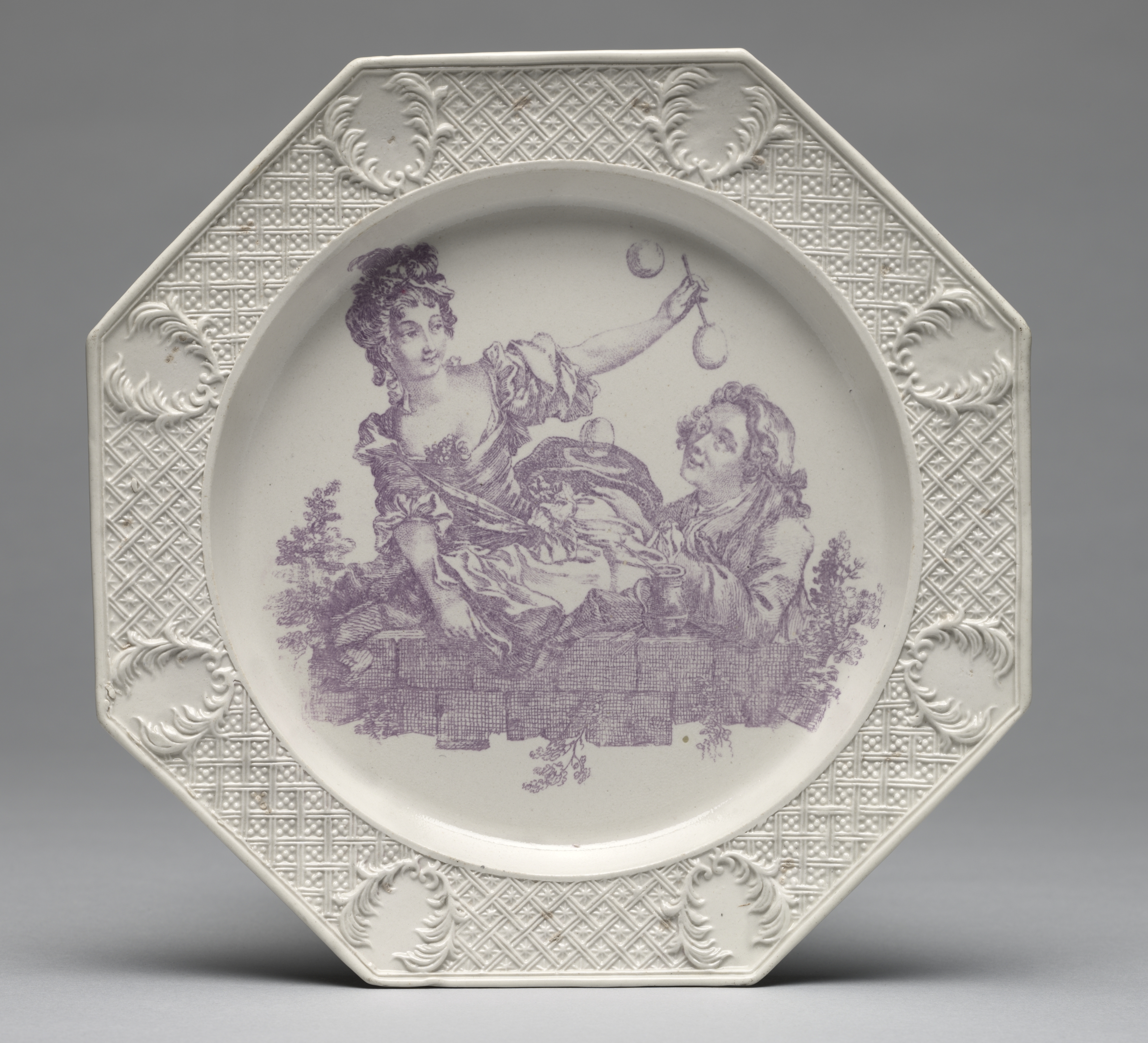 Octagonal white plate with a textured border featuring a repeating diamond pattern and leaf-like designs at each corner and midpoint. The plate has a large, round, shallow depression in the center. Inside the depression is a purple illustration of two people: a woman blowing bubbles with a wand and a man watching. The woman wears a dress with ruffles and a hairstyle with curls on top. The man has short, curly hair and sits on a low wall or ledge. There are plants on either side of them. The background of the image is gray.