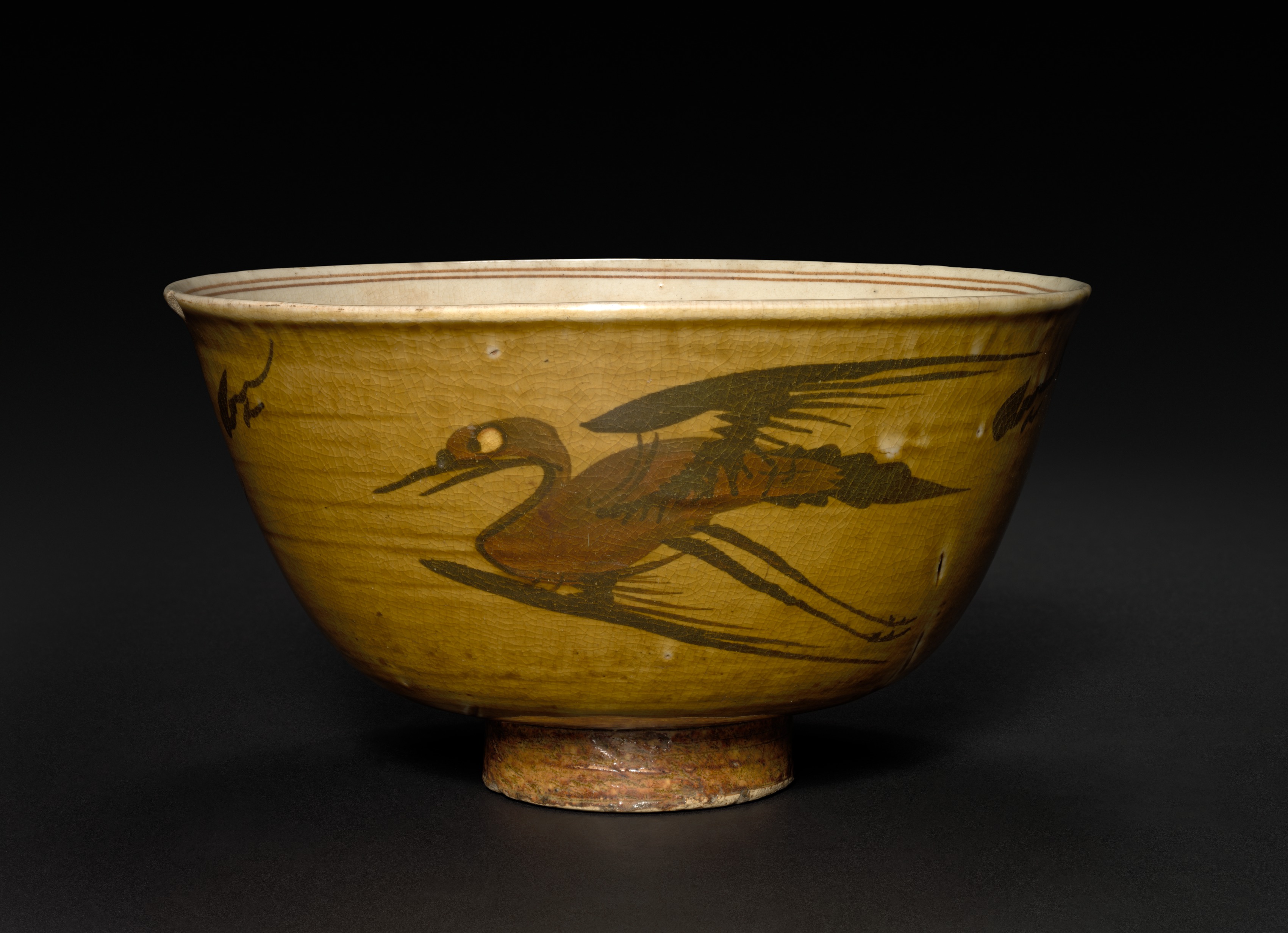 Yellow ceramic bowl with a wide mouth and a narrow base, featuring a brown bird design on the exterior. The bowl has a glossy finish. The interior of the bowl is light beige with two thin brown stripes around the rim. A brown bird with a long neck and legs, and large wings is painted on the exterior, appearing to be in mid-flight. The bird has a distinctive yellow eye. The background of the image is black. Title: Bowl. Artist: Unknown.