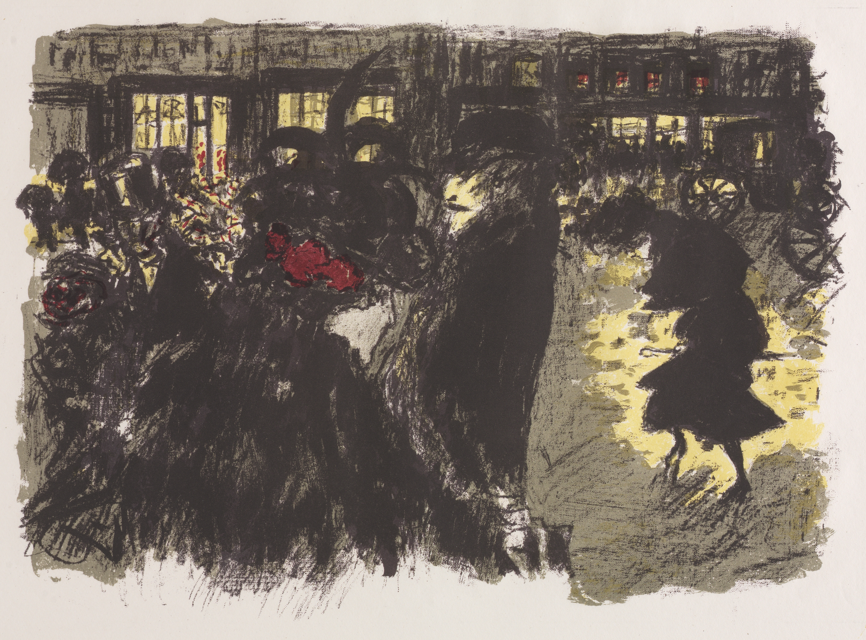 The Square at Evening by Pierre Bonnard depicts a nighttime scene of a city square. The painting features a predominantly dark color palette with touches of yellow and red. In the background, a large building with numerous lit windows spans the width of the composition. The foreground shows silhouetted figures of people, with one woman on the right side wearing a dark dress and a hat, possibly dancing or moving. The left side of the painting includes more figures and what appears to be a lamppost or a tree. The brushstrokes are expressive and the edges of the painting are rough. The overall mood is one of a lively urban evening scene. The color yellow is prominent, emanating from the building's windows and the ground. The artist's use of dark colors and bold brushstrokes creates a dynamic and vibrant atmosphere.