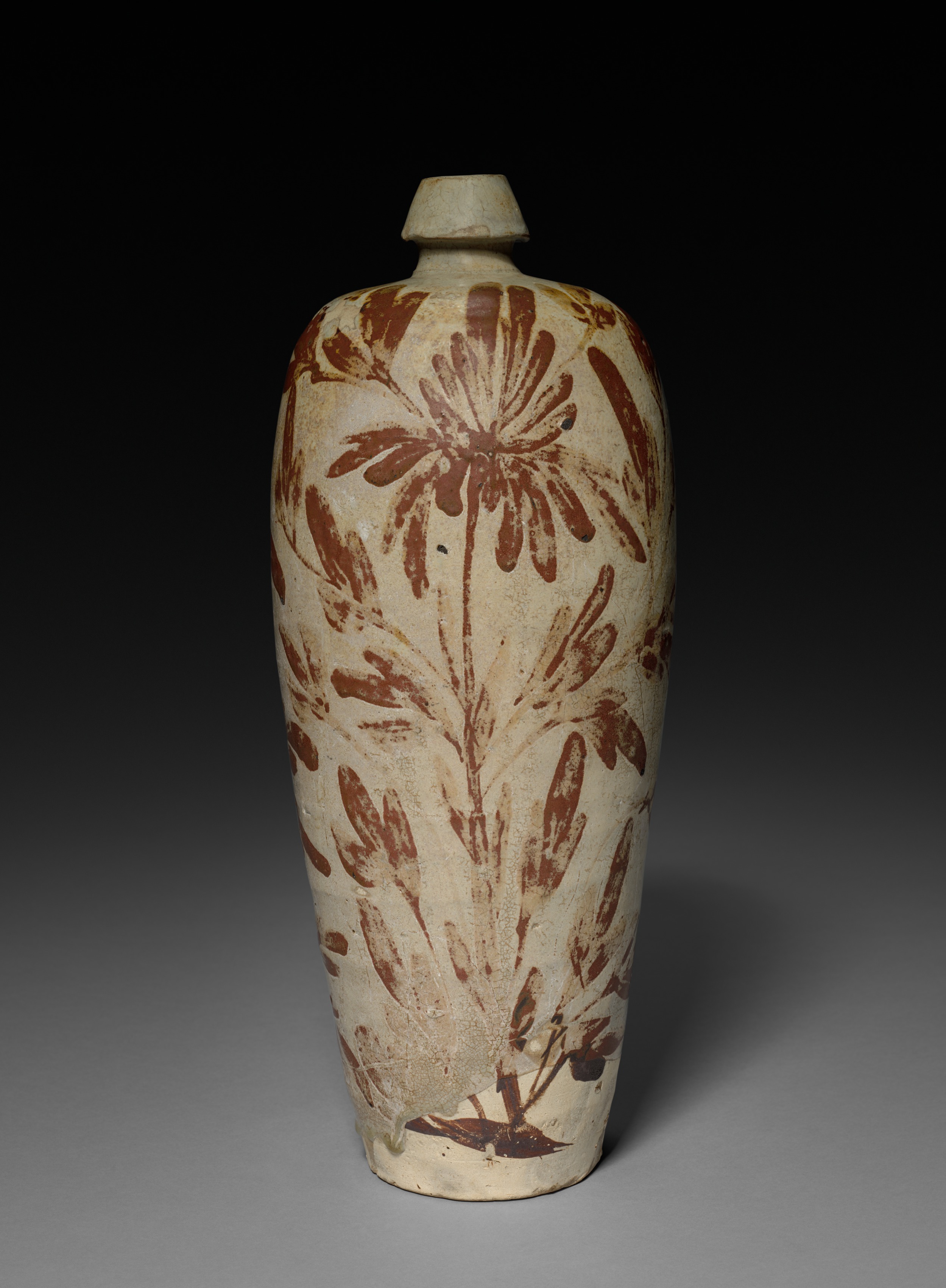 The vase is a tall, narrow ceramic piece with a light beige or off-white color. The vase has a wide body that tapers slightly towards the bottom and a short, narrow neck with a small opening at the top. The vase features a brown floral design painted on its surface. The design consists of several large flowers with long stems and leaves. The background of the image is dark, with a gradient that transitions from black at the top to gray at the bottom. The vase casts a shadow on the surface below it.
