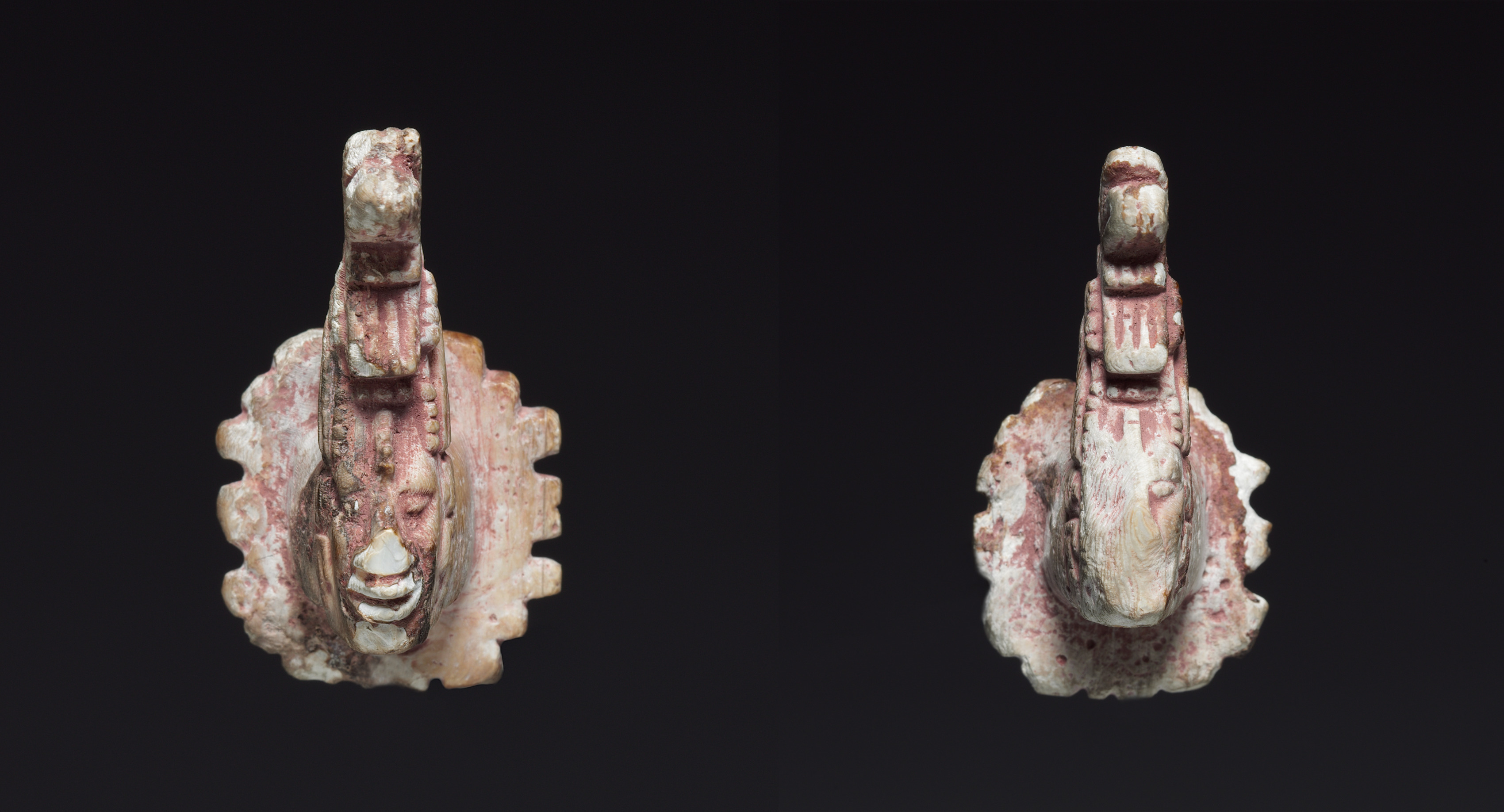 Pair of Ear Ornaments by Unknown. Two small, aged, white and reddish objects. Each object has a round base with a wavy edge. A figure stands on top of the base. The figure has a large head, small body, and no arms. The figure on the left faces forward and the figure on the right faces away. The background is black.