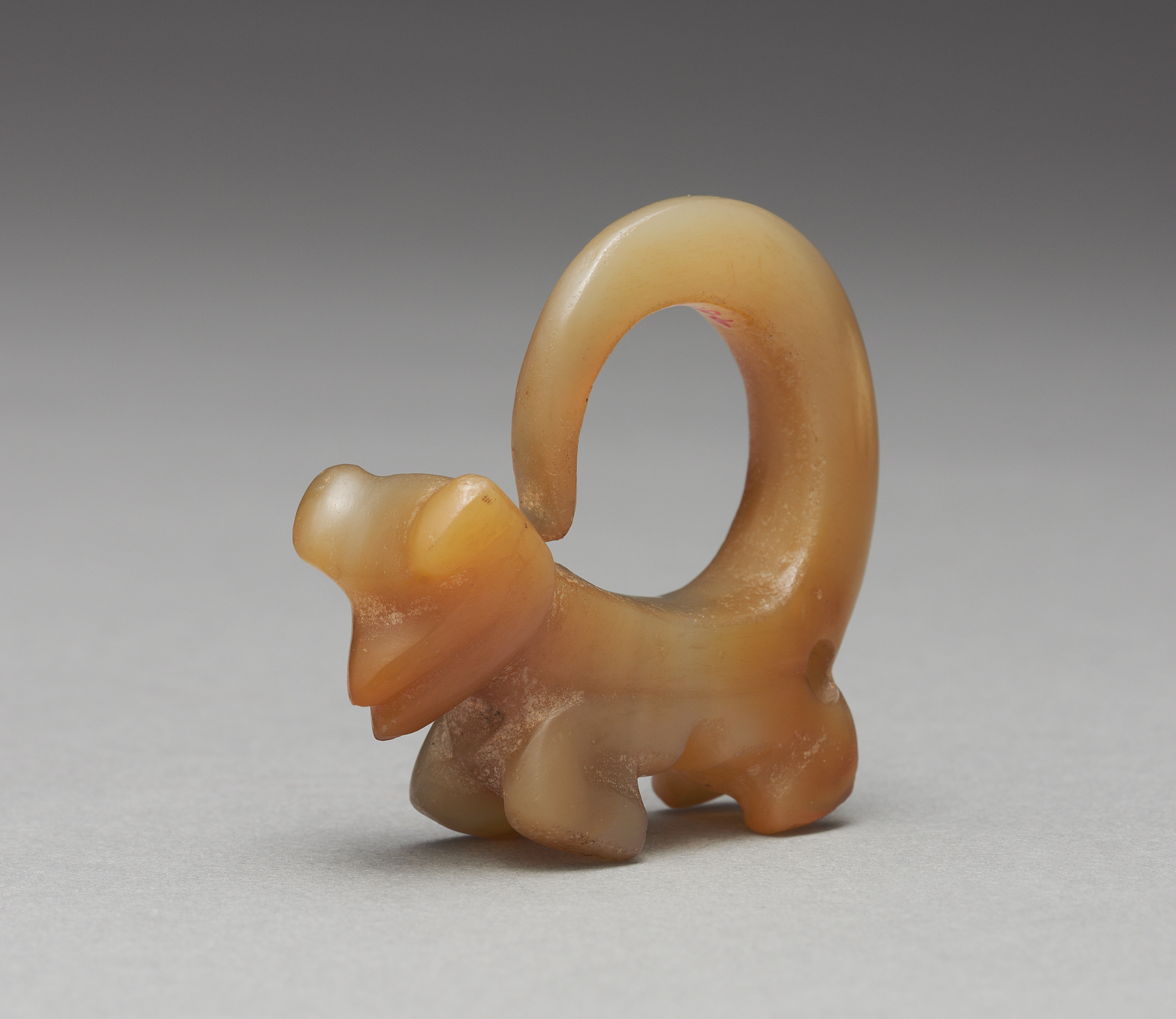 The pendant is made of a translucent, orange-brown stone. The stone animal has a curled tail. The animal has a thick neck and small legs. The head and body are smooth and shiny. The background is gray and darkens toward the top.