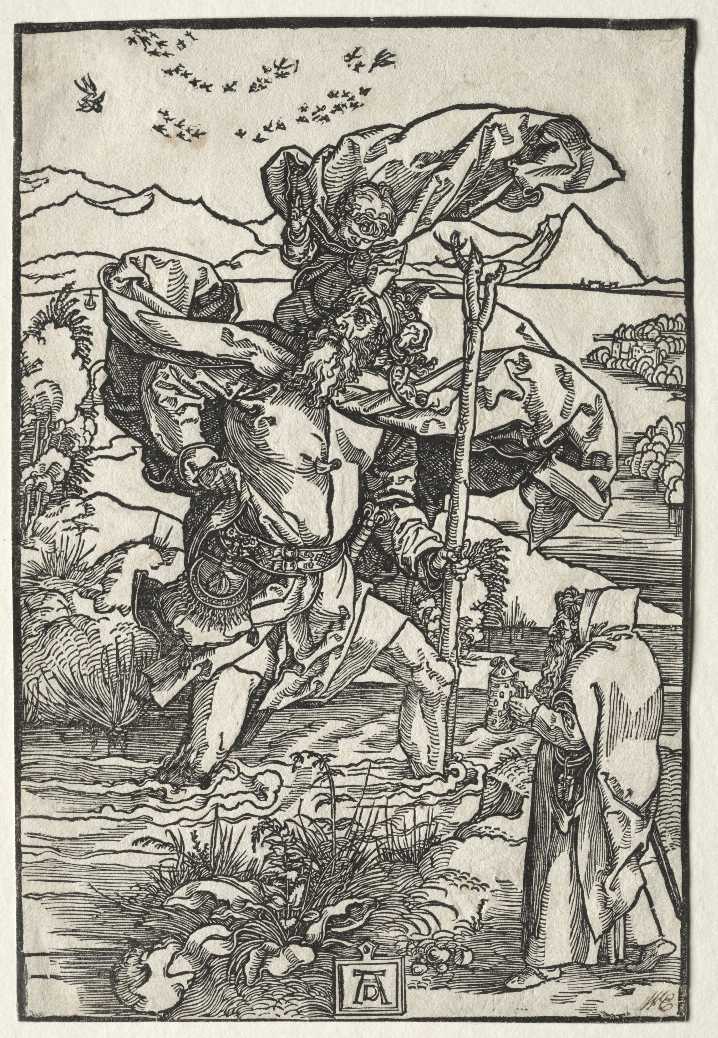 Black and white image of St. Christopher carrying a child across a body of water on a horse. St. Christopher wears a crown and holds a staff. The child is wrapped in a cloth and sits on his right shoulder. A figure stands on the shore. Mountains and trees are in the background. Birds are flying in the sky. The image is a woodcut.