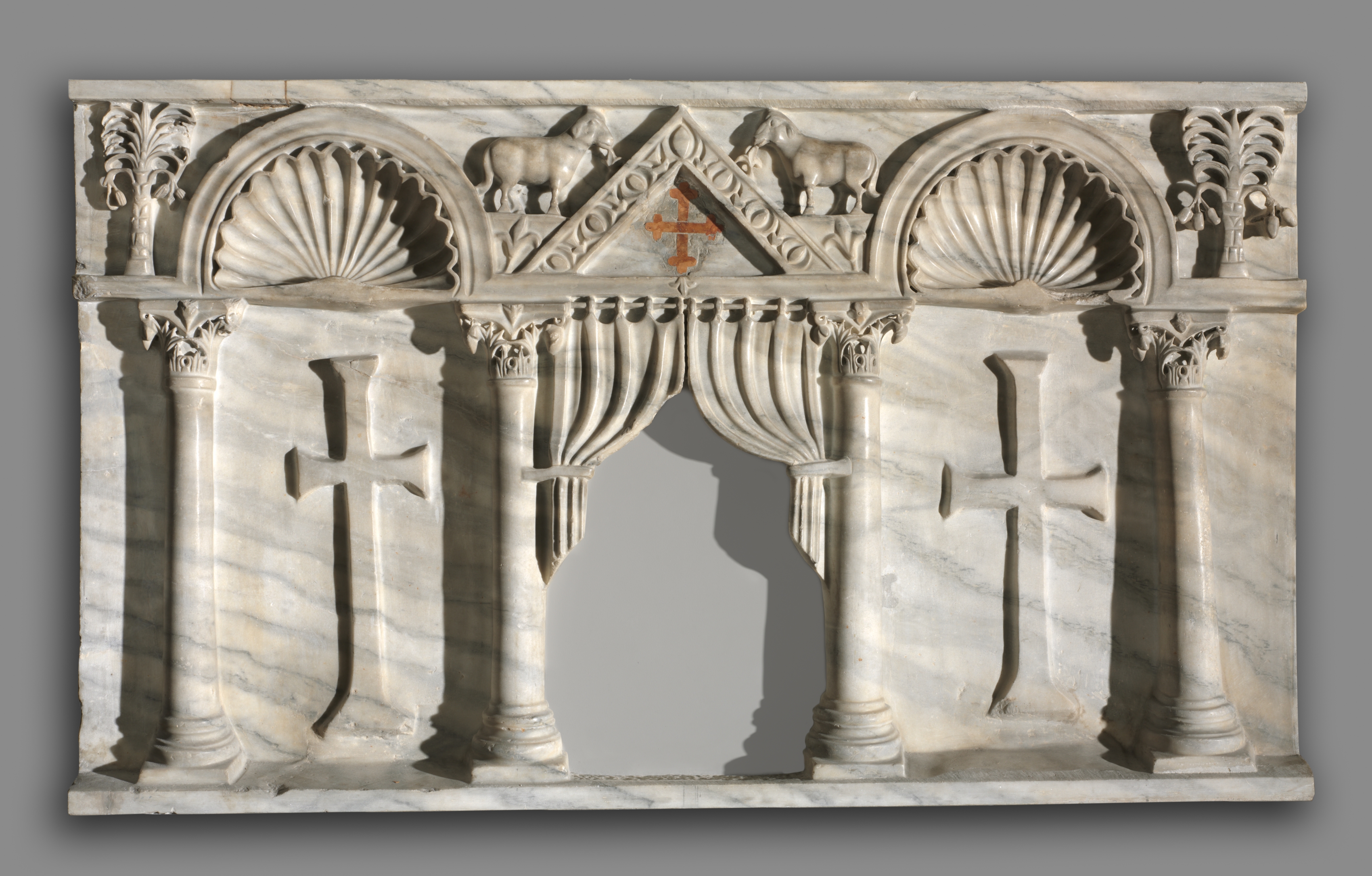 The Altar Front by an unknown artist shows a grayish-white marble relief sculpture. The top section contains two shell-like shapes on either side, with two animals, and two palm tree-like figures on the outermost corners. Between the shell-like shapes, a triangle with crosses on either side forms the base of a red cross with a T-shaped bottom. Below that are two rows of columns with ornate capitals on the top. The bottom row has column bases and a space between the two center columns. There are crosses carved on the two outer sections of the bottom. The background is a solid gray color.