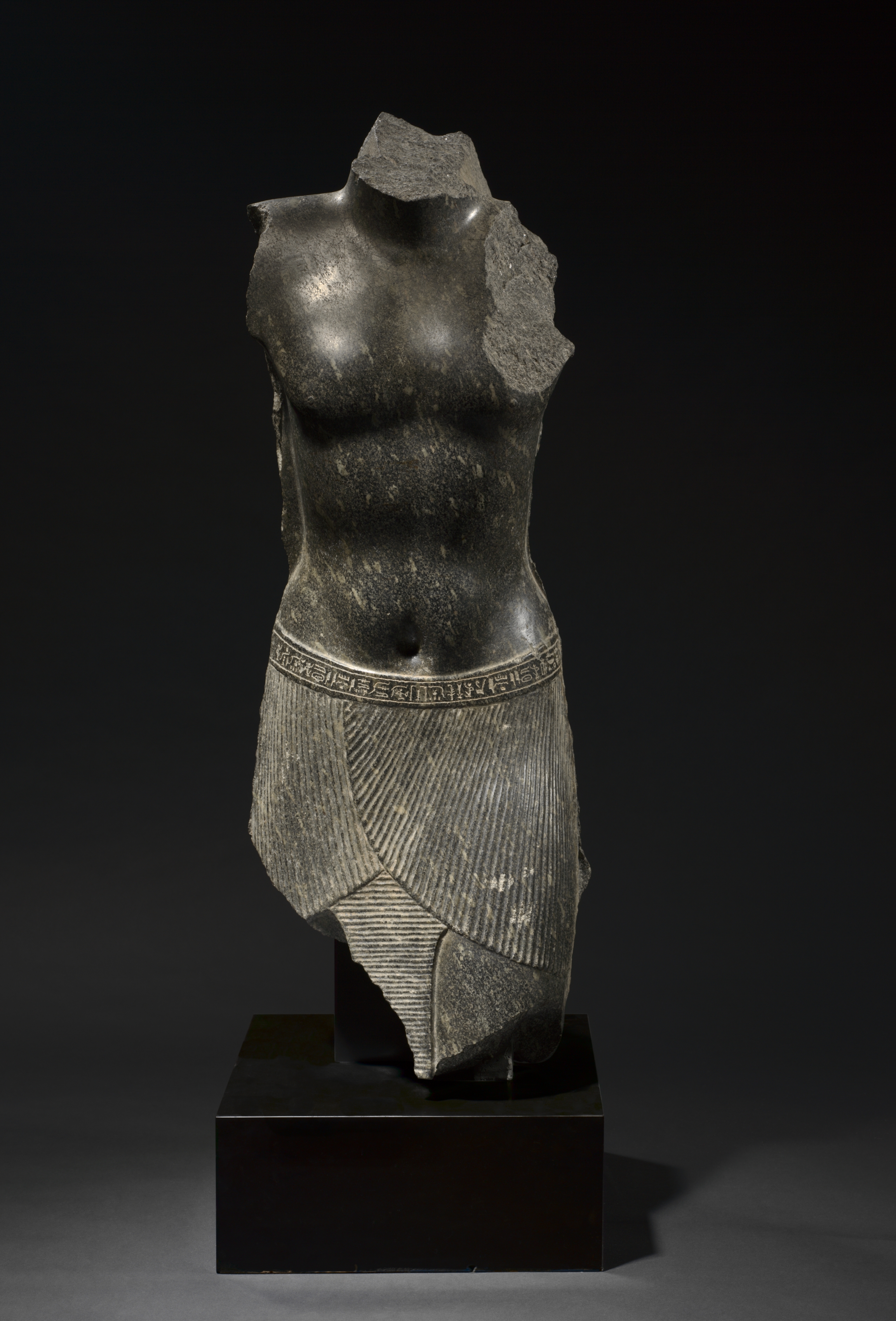 Torso of Amenpayom by an unknown artist. The sculpture depicts a stone torso of a male figure, missing the head and legs. The torso is made of dark gray stone and features a defined muscular structure. The figure wears a pleated kilt with a decorative border at the waist. The sculpture is mounted on a black rectangular base. The background is dark, highlighting the sculpture.