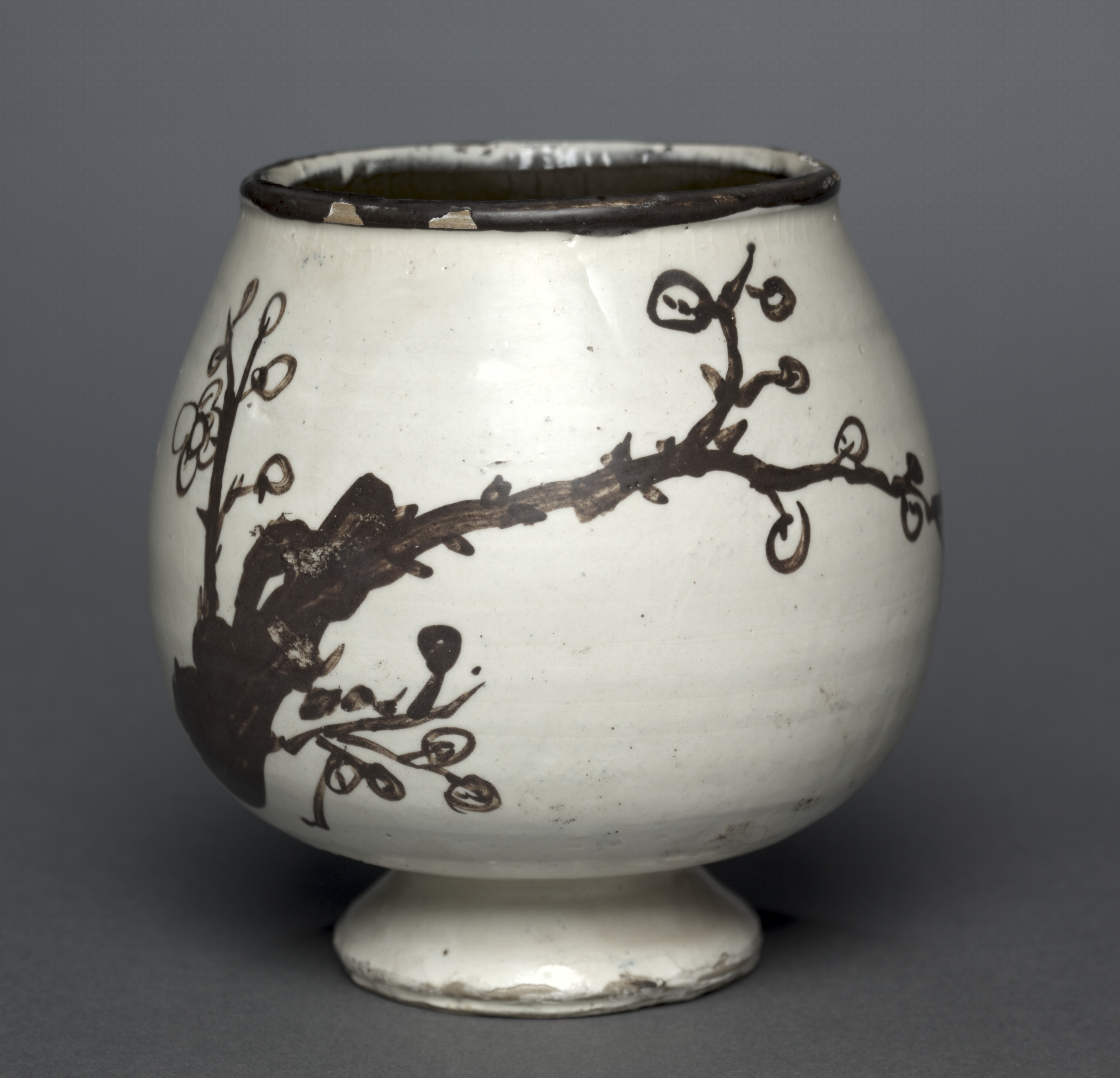The image depicts a white ceramic cup with a black design. The cup is bulbous with a short, wide base and a rounded body that curves inward to form the opening at the top. The opening has a black rim with small chips. A black design of a branch with small leaves and flowers wraps around the body. The background is a solid gray color. The cup is titled "Cup" and is by the artist Bernard Leach.