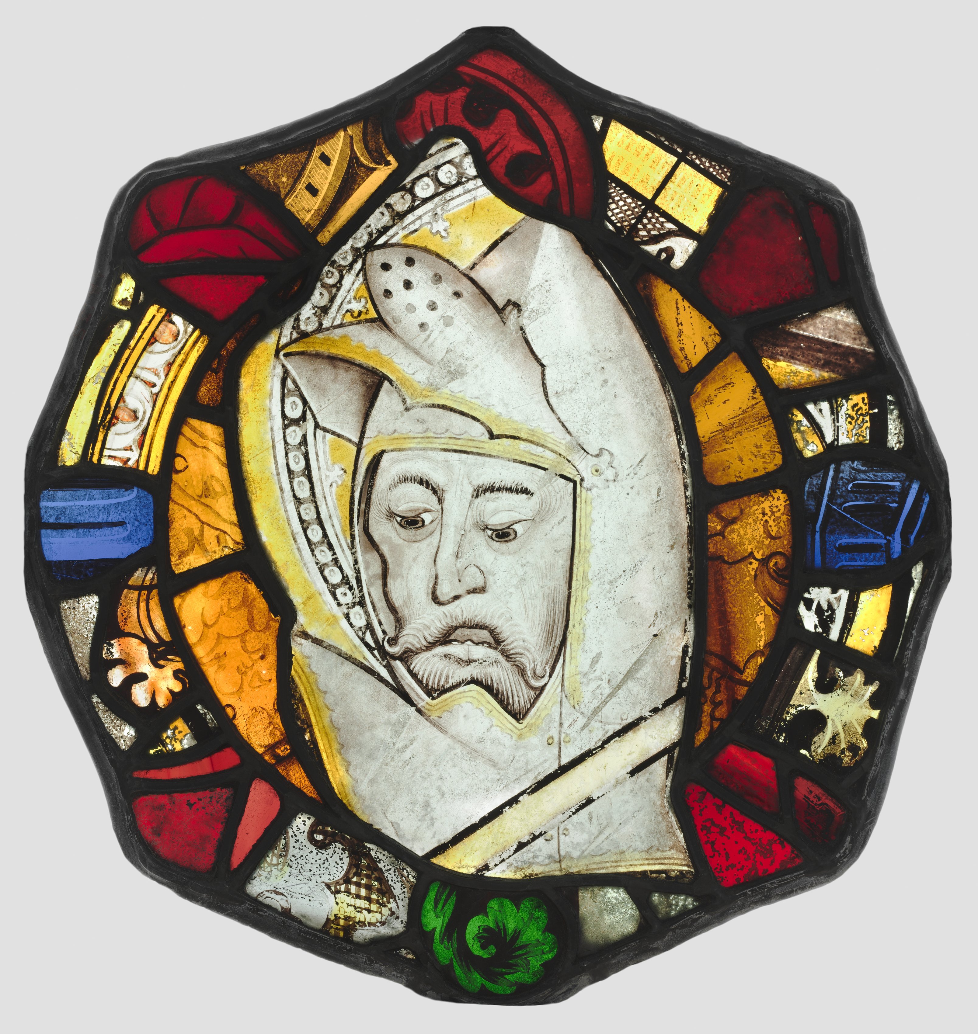 Stained glass artwork depicting Saint George. Central figure is a man wearing a white helmet with a gold trim and a white garment. The man's face has a mustache and looks to the right. The artwork's background consists of various shapes and colors including red, blue, green, yellow, orange, and gold. The stained glass pieces are outlined in black. The shape of the artwork is an irregular octagon. The man in the stained glass appears to have a serious expression.