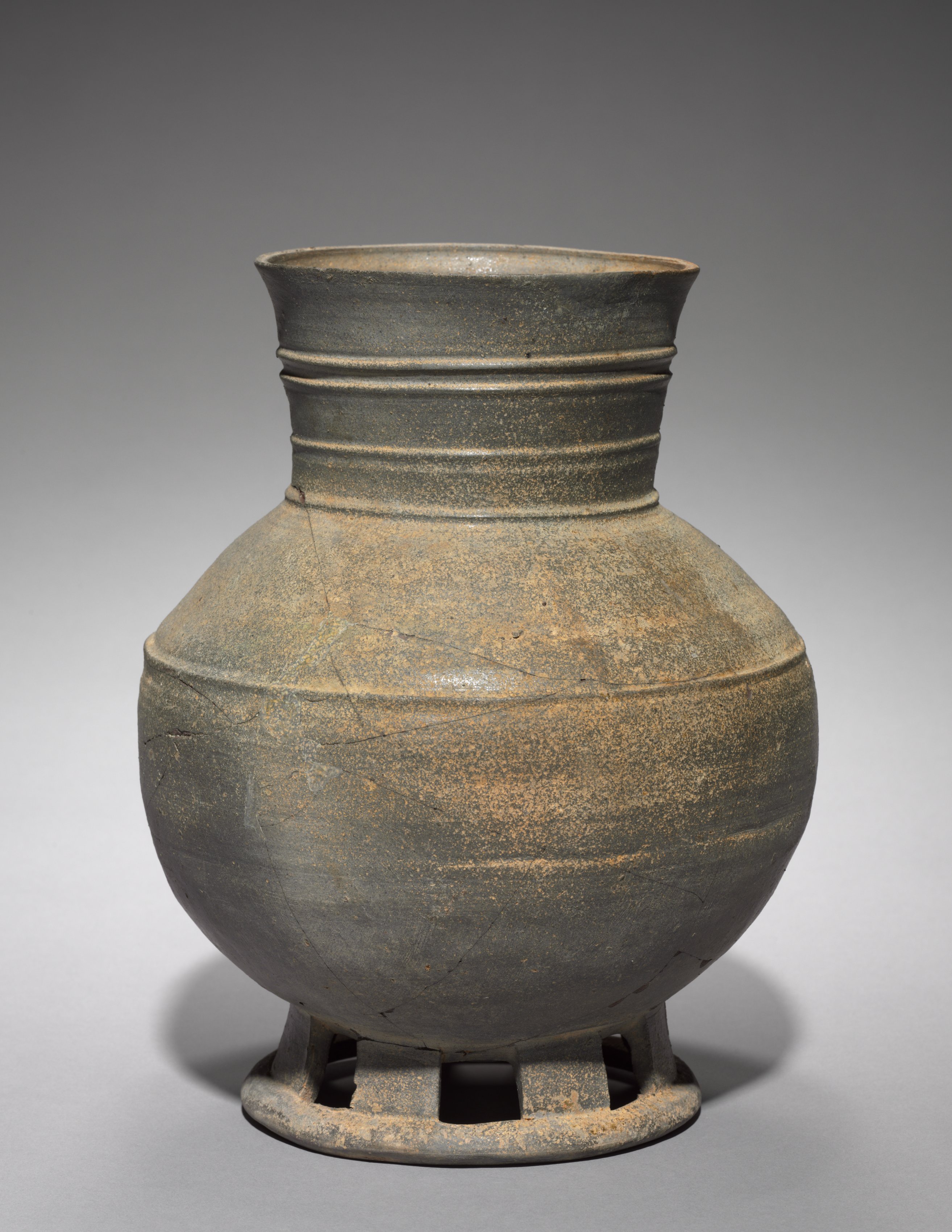 The Long-necked Jar by Leong Manh is a ceramic jar with a gray-brown color. The jar has a wide body that is rounded and tapers up to a short neck with three horizontal raised lines around it. The mouth of the jar is flared and rounded. It stands on a circular foot with four small legs. The jar's surface features a rough texture with visible scratches and marks. The background is a gradient of dark gray to light gray. The jar casts a shadow on the surface below it. The overall appearance suggests an ancient or traditional piece of pottery.