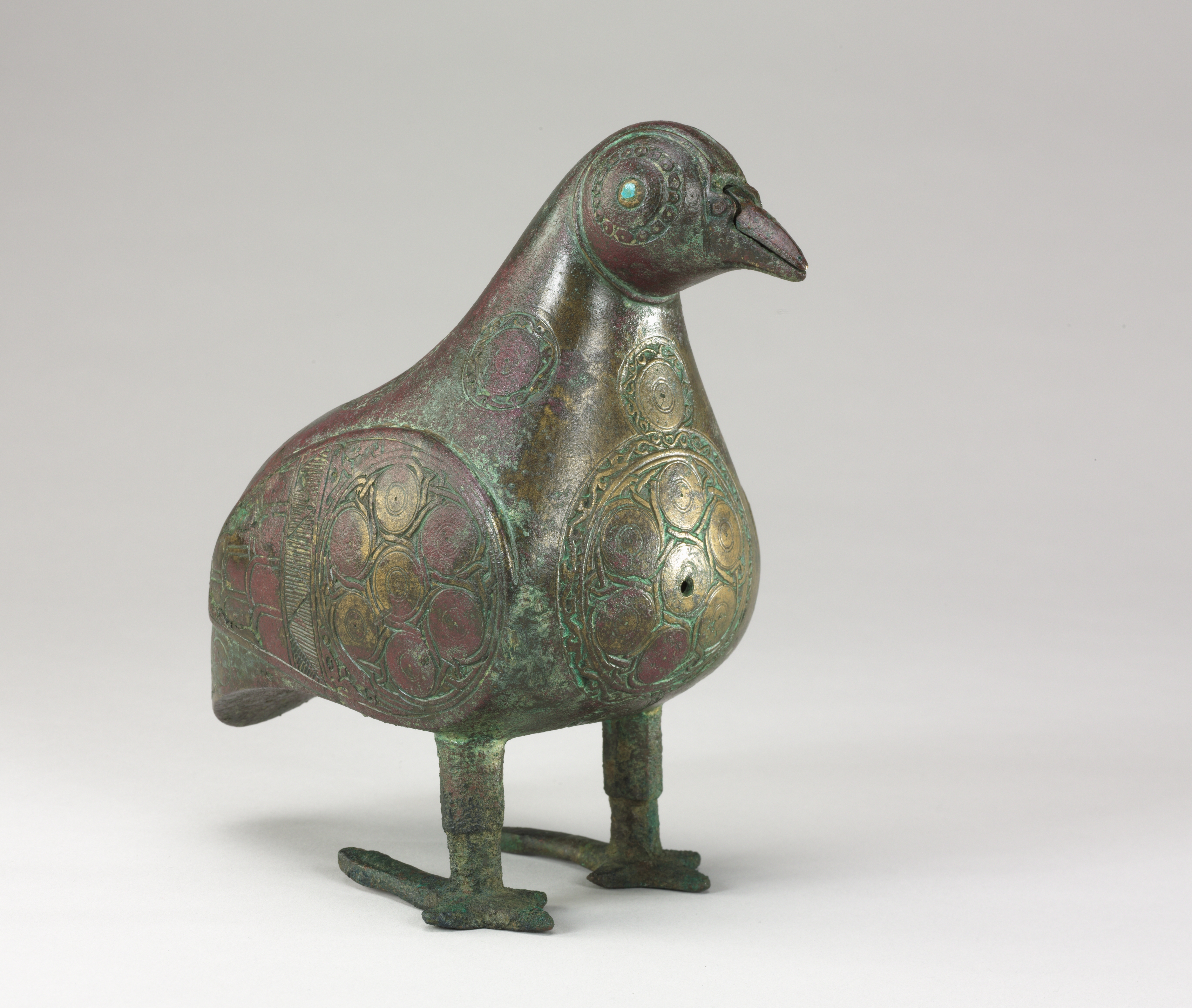 The Bird-shaped Vessel by Unknown Artist depicts a bird with a large body and small legs. The vessel is made of a dark green and reddish metal, likely bronze, with a patina. The body features raised circular designs, some with gold inlays. The head and beak are elongated. The eyes are circular with a turquoise inlay. The bird has a long tail and three-toed feet. The background is light gray.