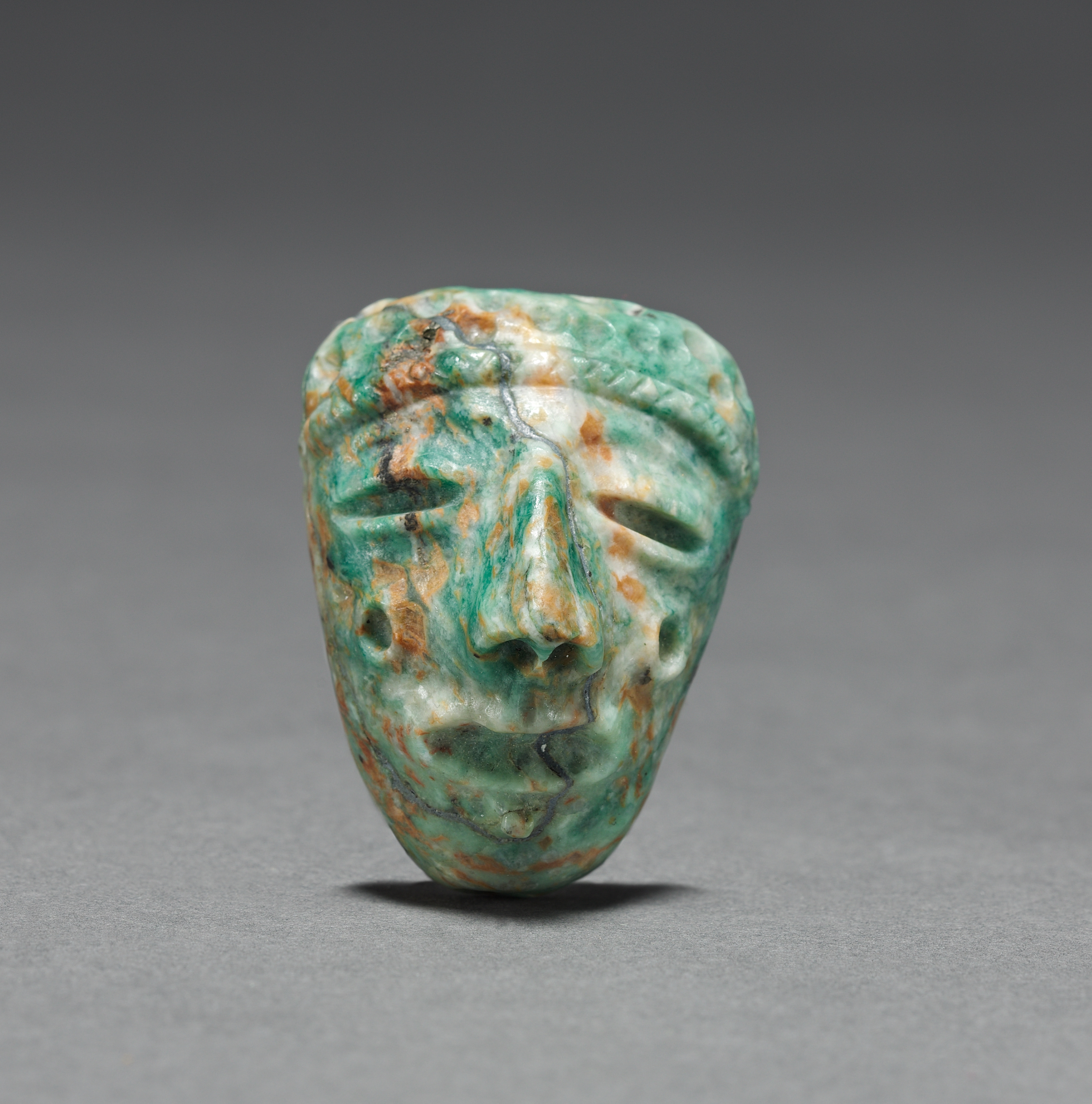 Green and brown stone or ceramic mask with a rounded triangular shape. The mask features a face with a nose, mouth, and eye holes. The background is a gradient gray. The mask is titled "Mask" by an unknown artist.