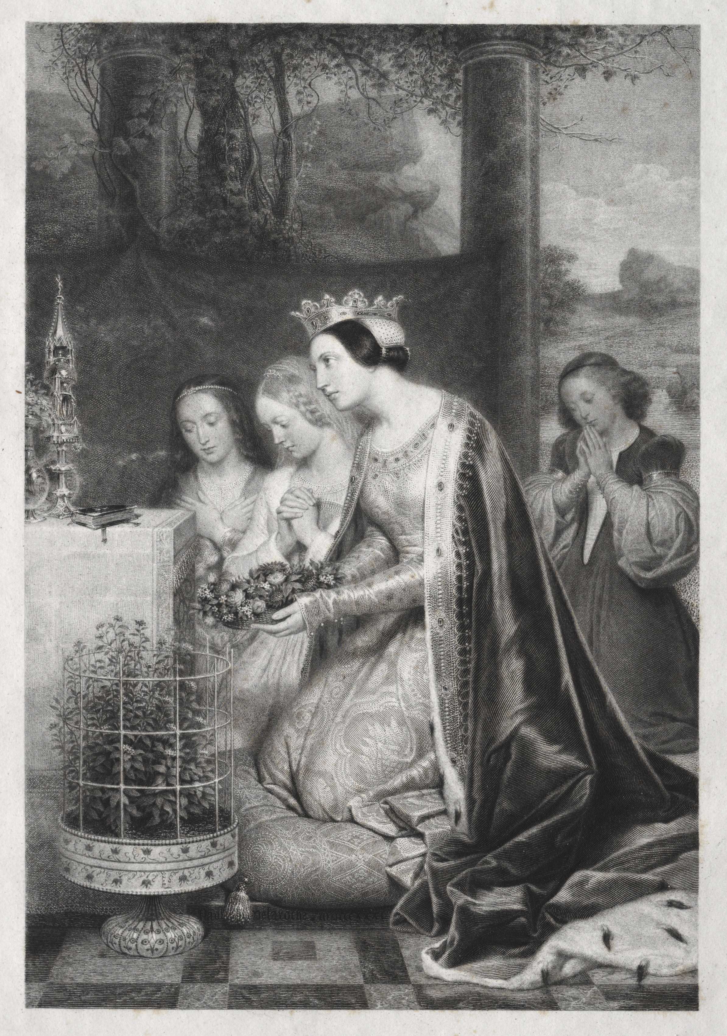 Black and white image of a woman wearing a crown and dress sitting on the floor. The woman is holding flowers. She has a cloak draped over her shoulders. Three other women are behind her. One woman is praying. There is a table with objects on it to the left. A birdcage is on the floor. The floor has a checkered pattern. There is a column and trees in the background.