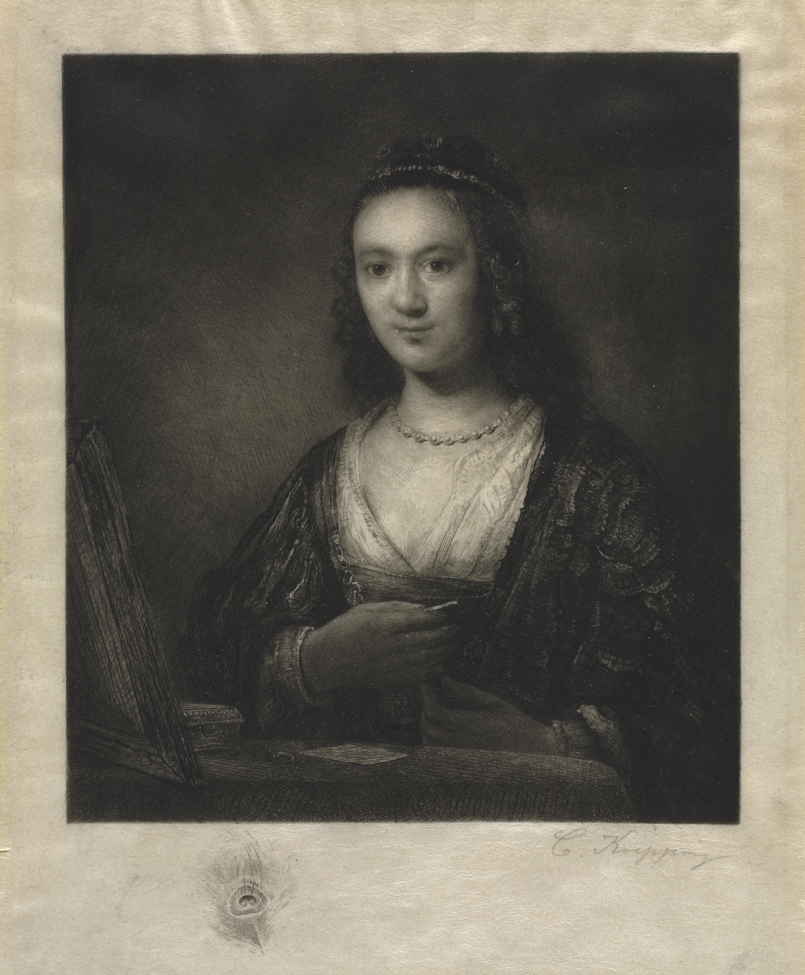 The Portrait of a Woman by Carl Köpping, depicts a woman sitting down. She has curly, dark hair topped with a headband. The woman is wearing a pearl necklace and a white low-cut blouse with a darker robe or shawl wrapped around her. Her right arm is bent at the elbow, with her hand positioned in front of her body. To her left side, there is an object resembling a book or fan. The background of the portrait is dark, providing contrast to the subject. The image is rendered in shades of black and white, with the artist's signature visible at the bottom.