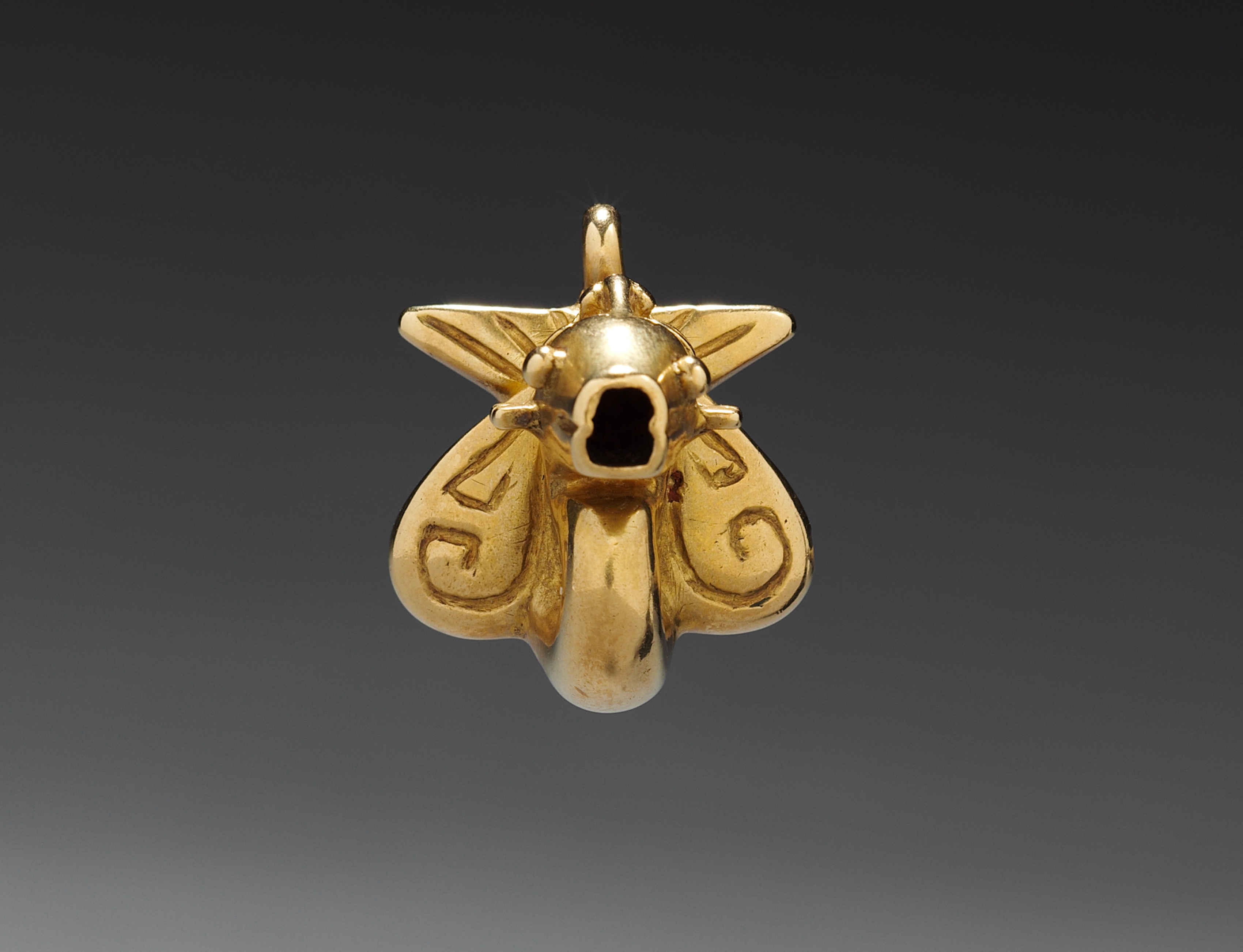Gold pendant in the shape of a bee, titled "Pendant" by an unknown artist. The pendant features a gold bee with a large head, two wings on either side, and a long, protruding tongue. The bee's wings are decorated with curled designs. A small loop at the top allows for attachment to a chain. The bee's mouth is open, forming a hollow space. The background is dark gray, transitioning to light gray at the bottom.