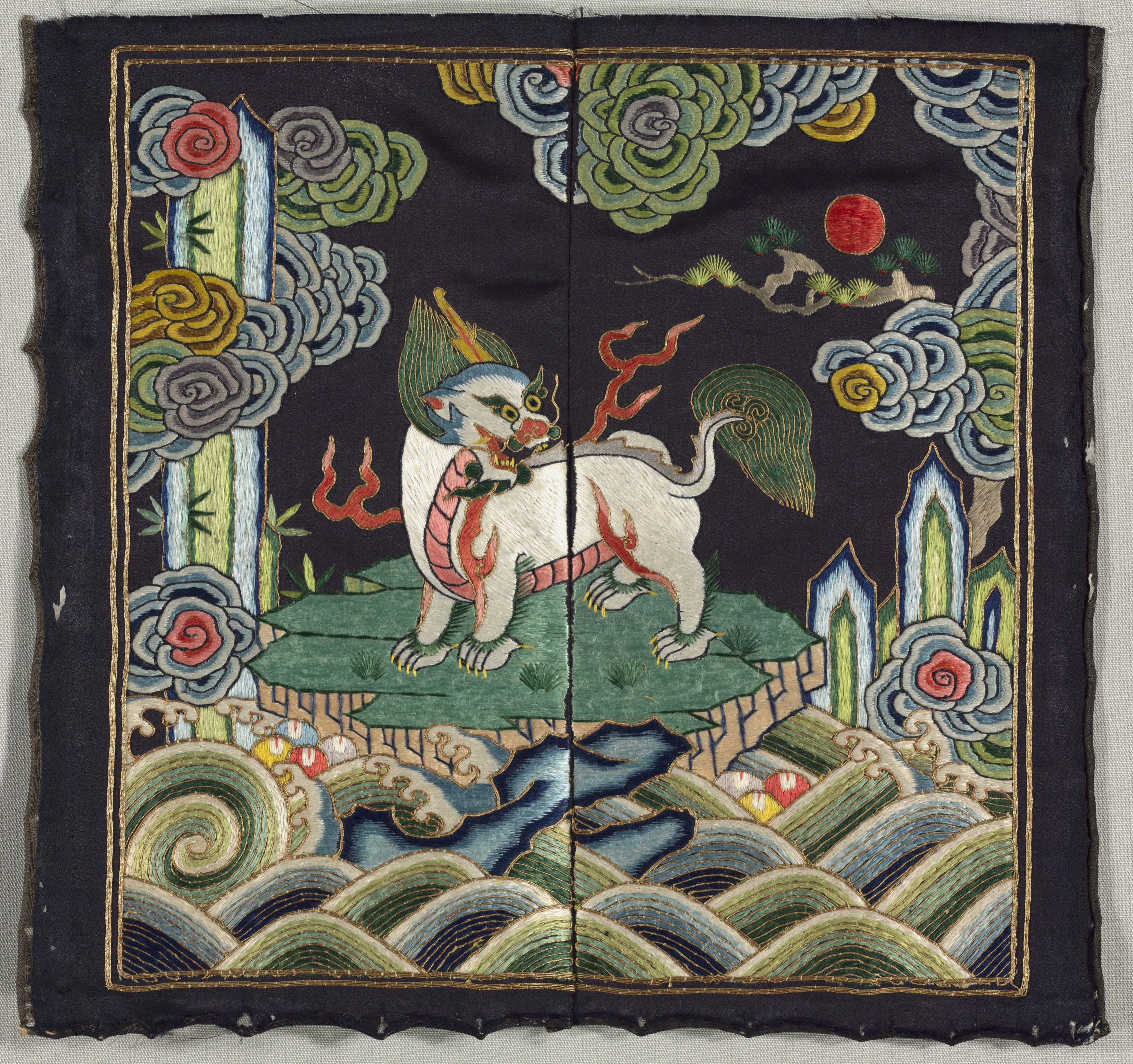 Black square fabric with wavy edges, gold border; white lion-like creature with red stripes, green tufted ears, and a green tuft on top of head standing on green patch; surrounded by green waves, blue and pink roses, green and blue clouds; red sun and red flames; stone wall and gate. Rank Badge (buzi).