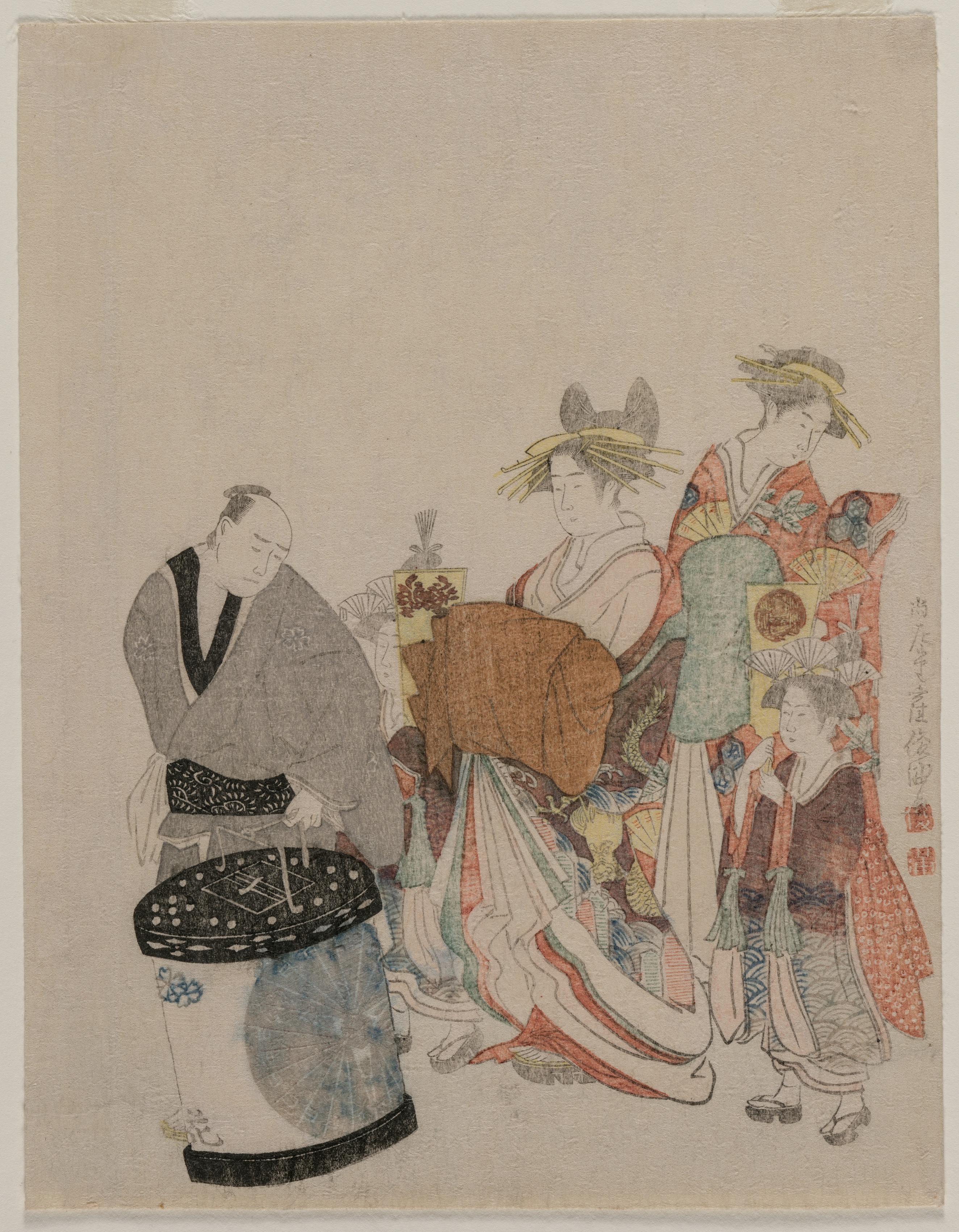 A Japanese woodblock print depicts a man and two women. The man on the left wears a gray kimono with a black sash and sits next to a large cylindrical object covered with a black cloth featuring white designs. His head is bowed towards the object. The woman in the middle wears a kimono with orange, white and green designs with a yellow hairpiece. She holds a folded brown cloth. A smaller woman stands to her right and wears a dark kimono and a white hairpiece. A woman on the right wears a kimono with orange, yellow and blue designs and a green under kimono. Her kimono features dragons and fans. She has a yellow hairpiece. The background is beige with some Japanese characters on the right edge.