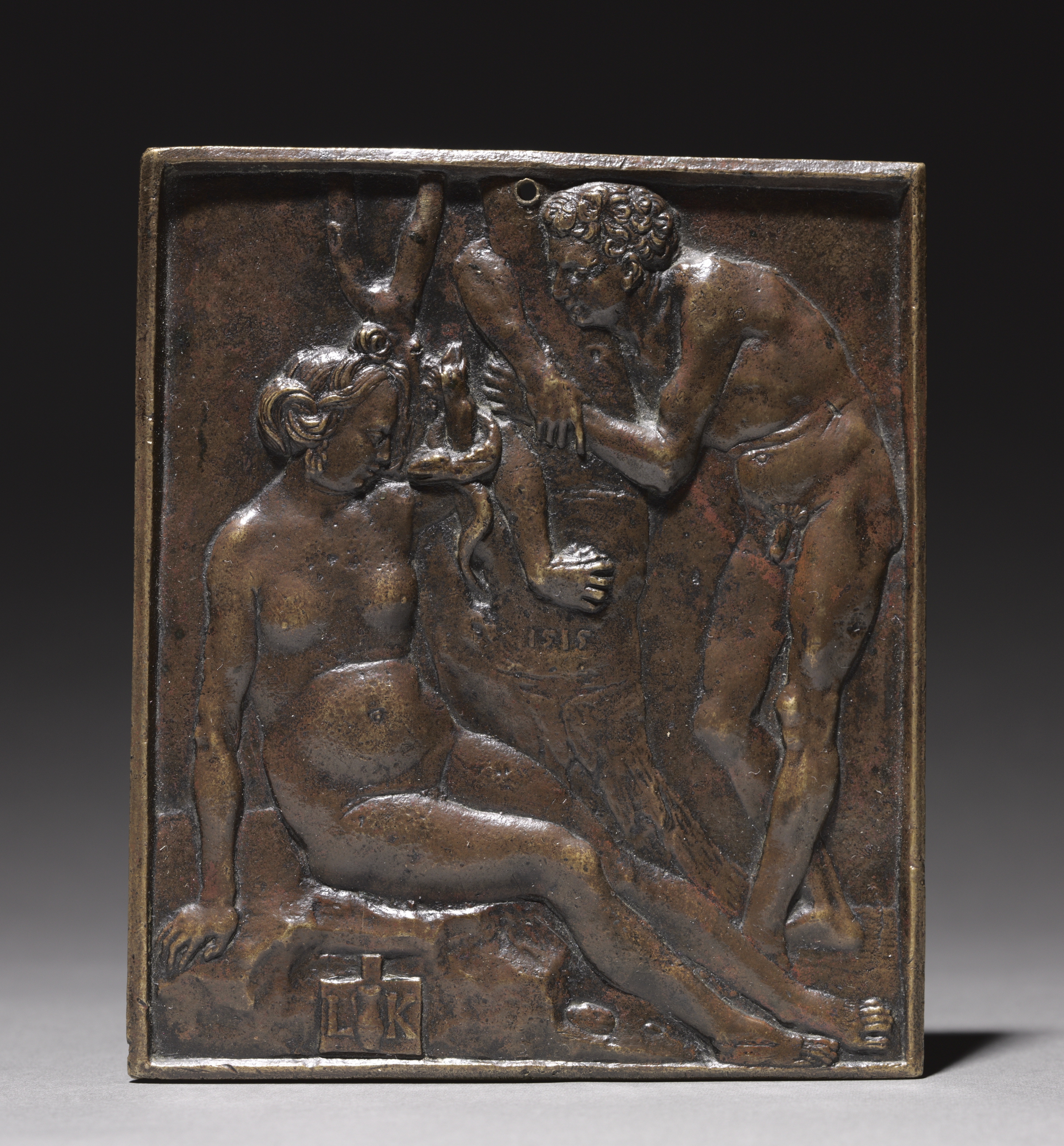 A bronze plaque depicting Adam and Eve. The plaque is rectangular with a raised border around the edge. Two nude figures, a man and a woman, are in the center. The woman sits on the left, her body facing right, with her head turned left. Her hair is pulled back from her face. Her right arm is bent at the elbow and her hand rests on her knee. Her left arm is bent at the elbow and she holds an apple in her hand. The man stands on the right. He has curly hair and his body faces left. He holds a branch from a tree with his left hand. The man holds the woman's right wrist with his right hand. The woman's left leg is extended behind her. The man's right leg is slightly bent. The background of the plaque is textured. The artist's initials are in the bottom corners. A date is engraved on the tree. The plaque casts a shadow on a gray surface against a black background.