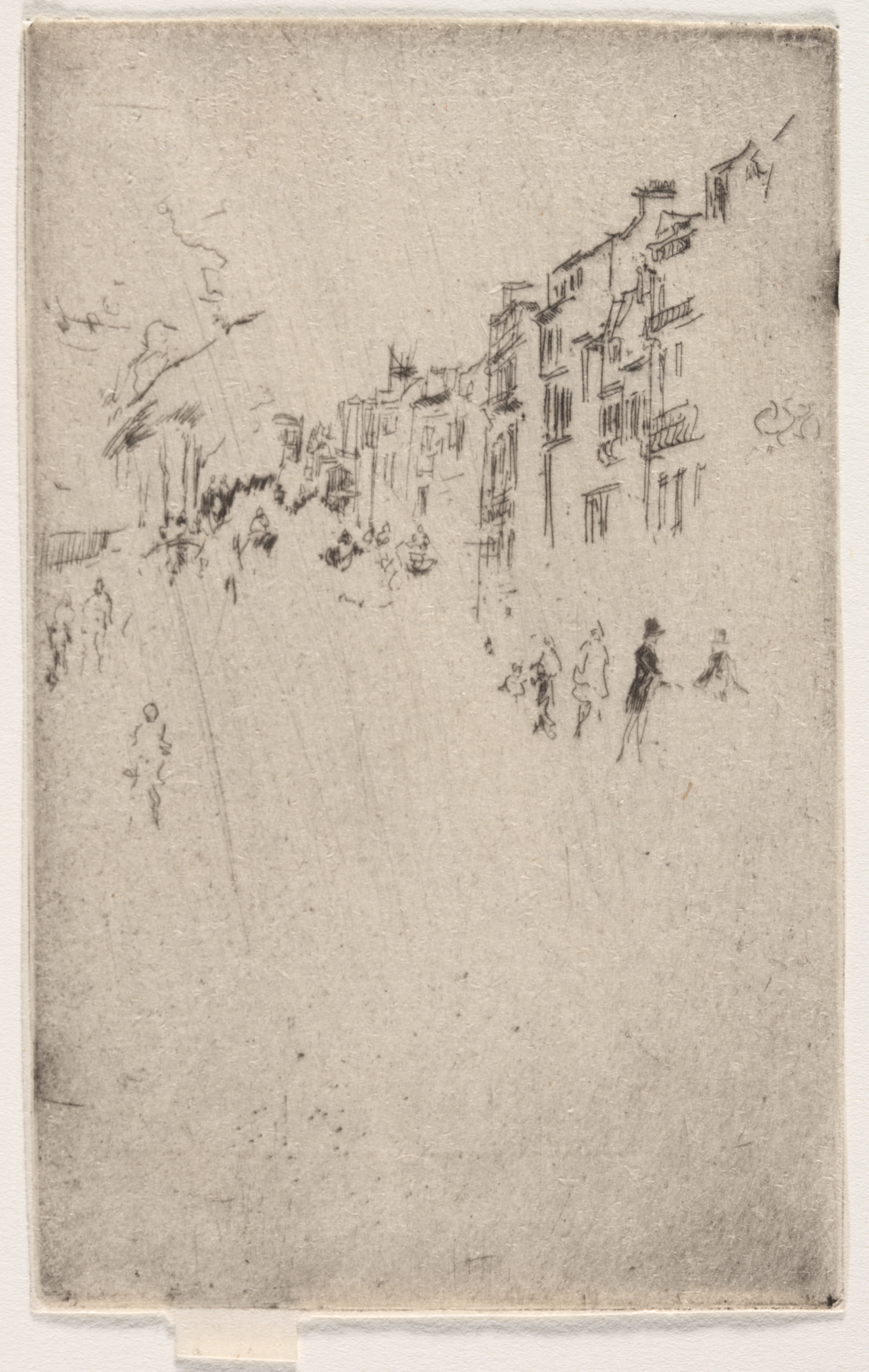 The image depicts a sketch of a city street. The street is lined with tall buildings on the right side; the buildings are drawn with many short lines, indicating windows, and some lines suggesting balconies and roof details. The buildings appear to be several stories high. On the left side of the image, there are some indistinct shapes that could represent trees or other foliage. Several people are scattered throughout the street, drawn in simple lines. The street appears empty and wide. The entire scene is drawn on what appears to be aged paper with a light-brown color. The drawing style is simple and appears to be done with a fine point. The image is titled "A Fragment of Piccadilly" by James McNeill Whistler.