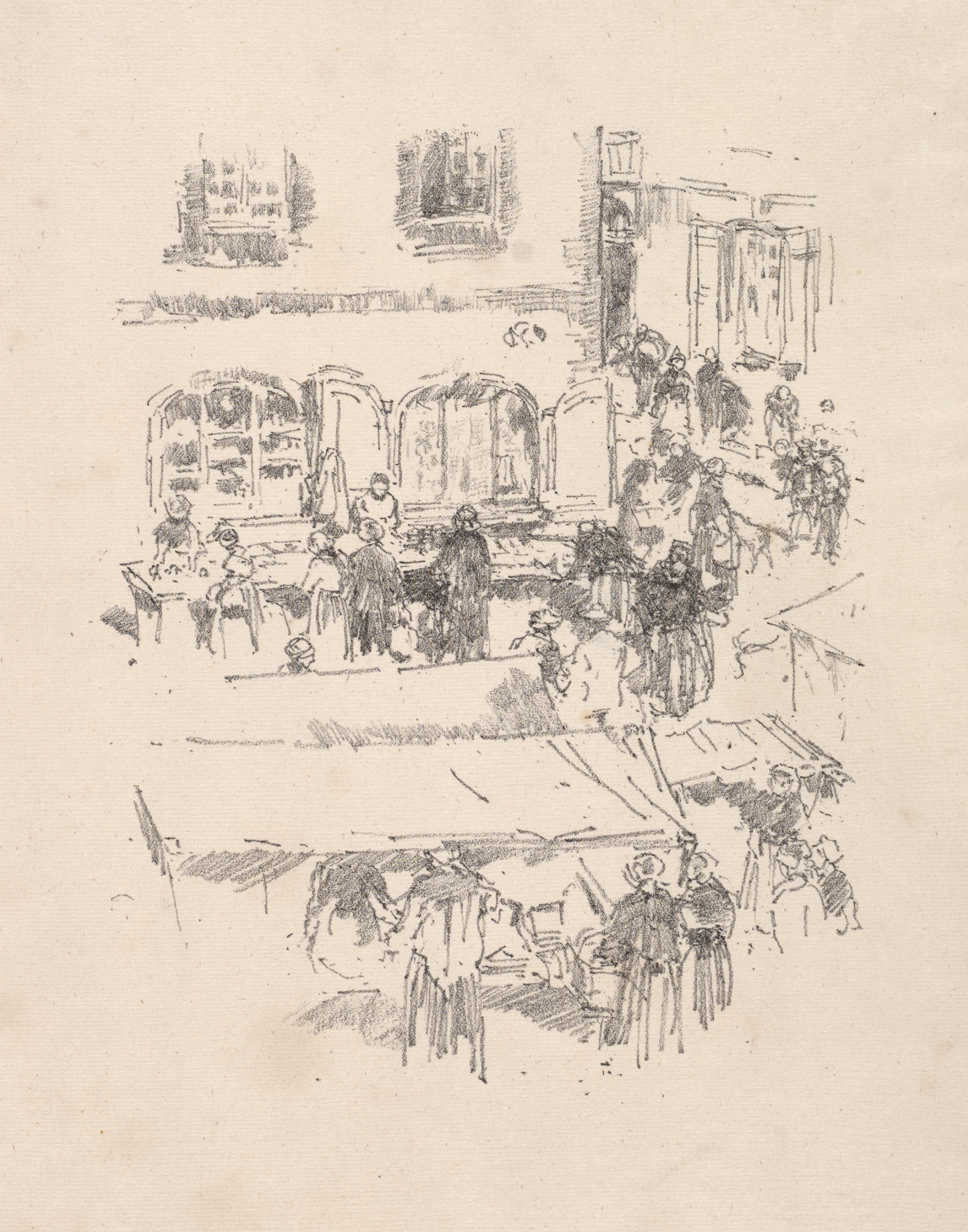 The image depicts a black and white sketch of an outdoor marketplace scene. The marketplace is filled with people, some standing under canopies or tents. The scene is set against a backdrop of buildings with windows and archways. Two small sketches are positioned at the top of the image. The entire scene is rendered on a beige background with visible texture, resembling paper. The marketplace scene by James McNeill Whistler is titled "The Market Place, Vitre".