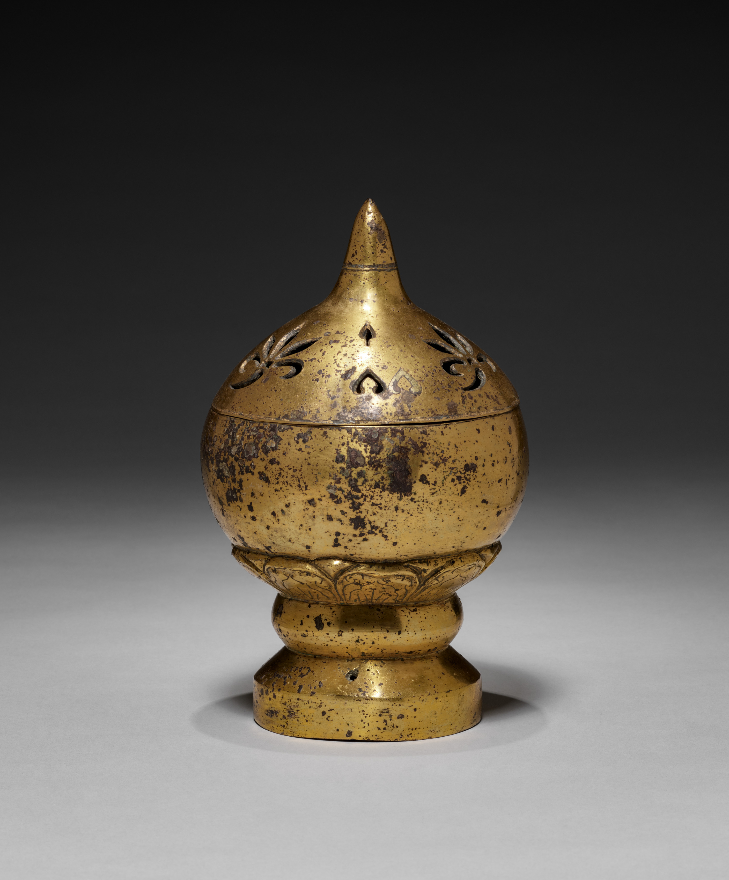 Gold-colored metal object with a rounded body and a pointed top, sitting on a short base. The object has a bulbous middle section with a narrow top and bottom. The top section tapers to a point. There are decorative etchings around the top and middle of the object. The object is made of a gold-colored metal, possibly brass or bronze, and has a weathered appearance with visible spots and discoloration. The background is dark at the top and lightens towards the bottom. The title of the object is "Censer".