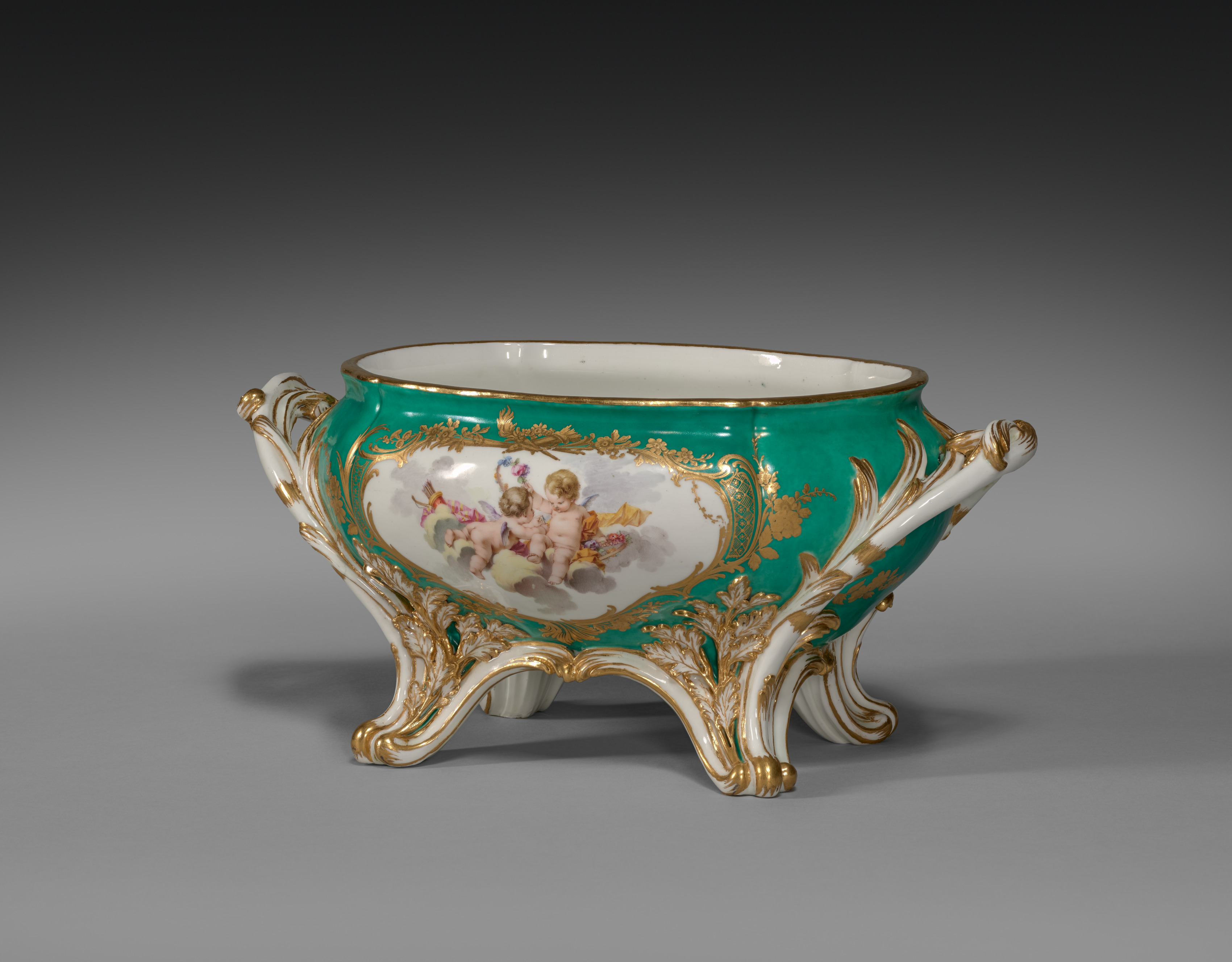 Tureen by Sèvres Porcelain Factory: A large, ornate, three-footed porcelain tureen with a green and white body, adorned with gold accents and a painting of two cherubs on the front. The tureen has two handles on either side. The base and handles are decorated with gold filigree. The interior is white. The body has a green band at the top and bottom. Gold trim runs along the rim. The background of the image is gray, with a shadow cast by the tureen.