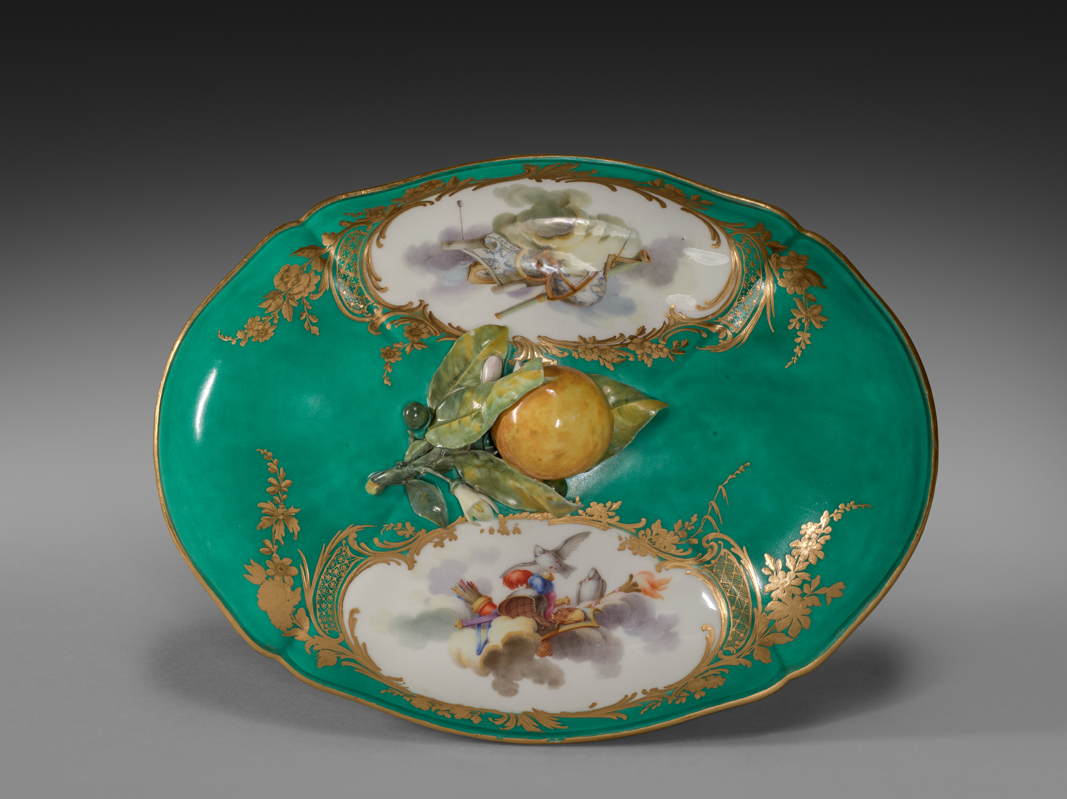 Green porcelain tureen cover with gold trim and two oval painted panels, one with birds and foliage and the other with birds; gold foliage decoration on green ground; three-dimensional representation of an orange and leaves between the panels.