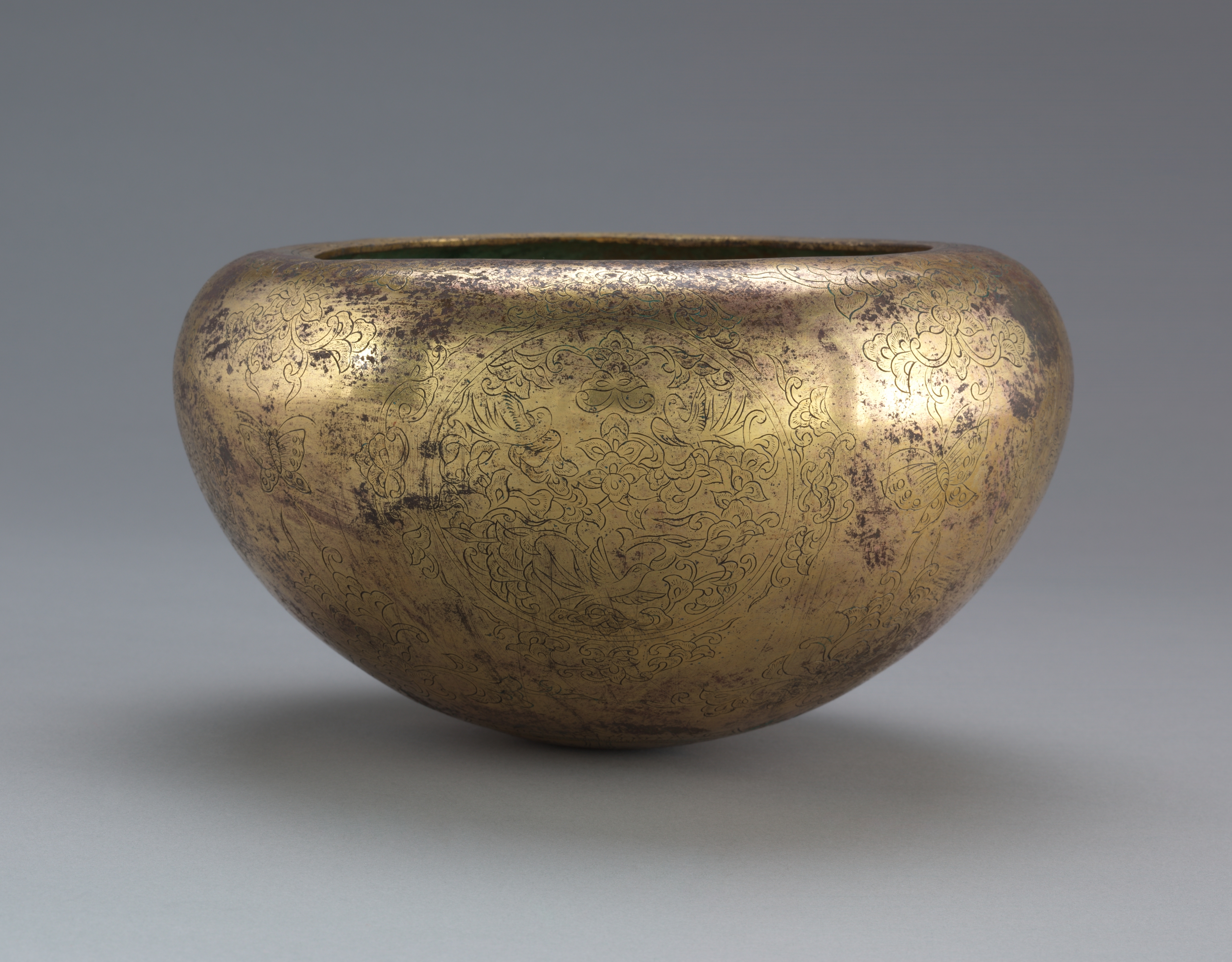 Large, rounded bowl with a wide mouth and a flat bottom. The bowl is made of a brass or gold-colored metal with a smooth, shiny surface. The surface has a decorative etched design featuring intricate, swirling patterns and flowers. The etchings are darker than the rest of the bowl, creating a contrasting effect. Dark spots are scattered across the surface, giving it a worn, aged appearance. The background is a gradient gray color, with the bowl casting a shadow on the surface below. The title of the piece is "Alms Bowl".