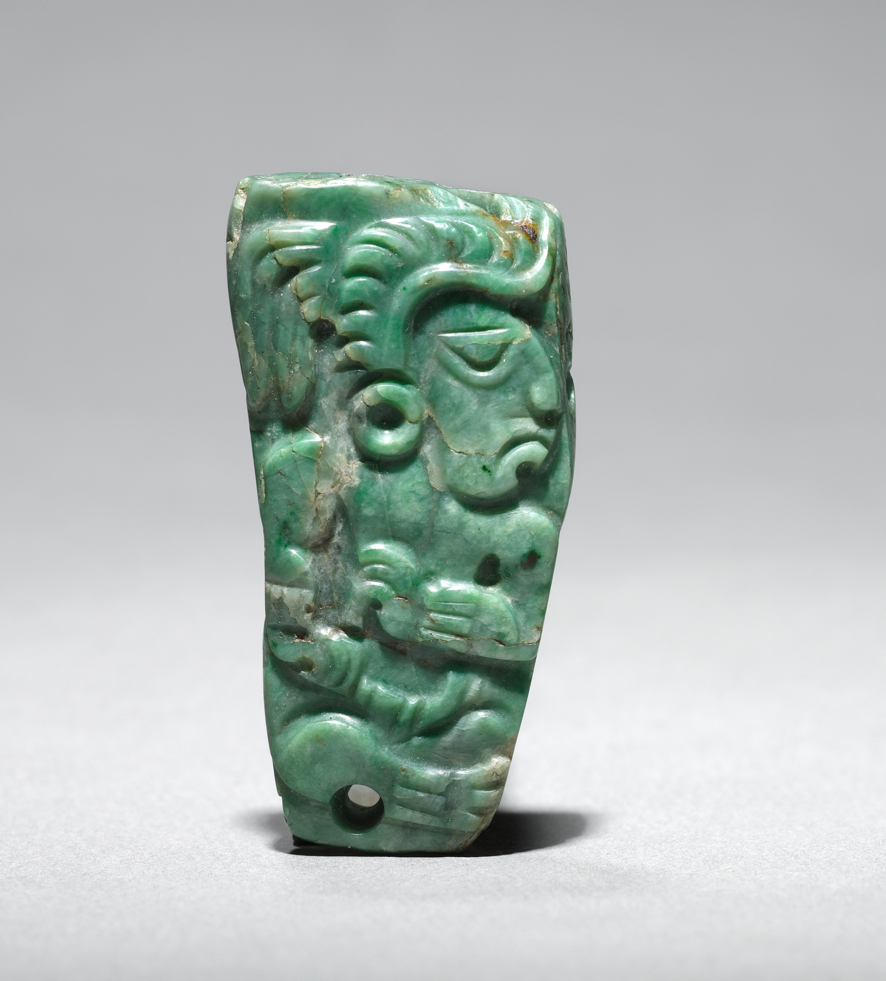 Green jade ornament in the shape of a face. Rectangular with rounded edges and tapered sides that are narrower at the bottom. The face has a large nose and eybrow, one eye with a triangular iris, and a closed mouth. The face appears to have a large ear on the left side. The ornament appears to have a drill hole on either side of the face. The face appears to have some form of hair on top. The background of the image is grey.