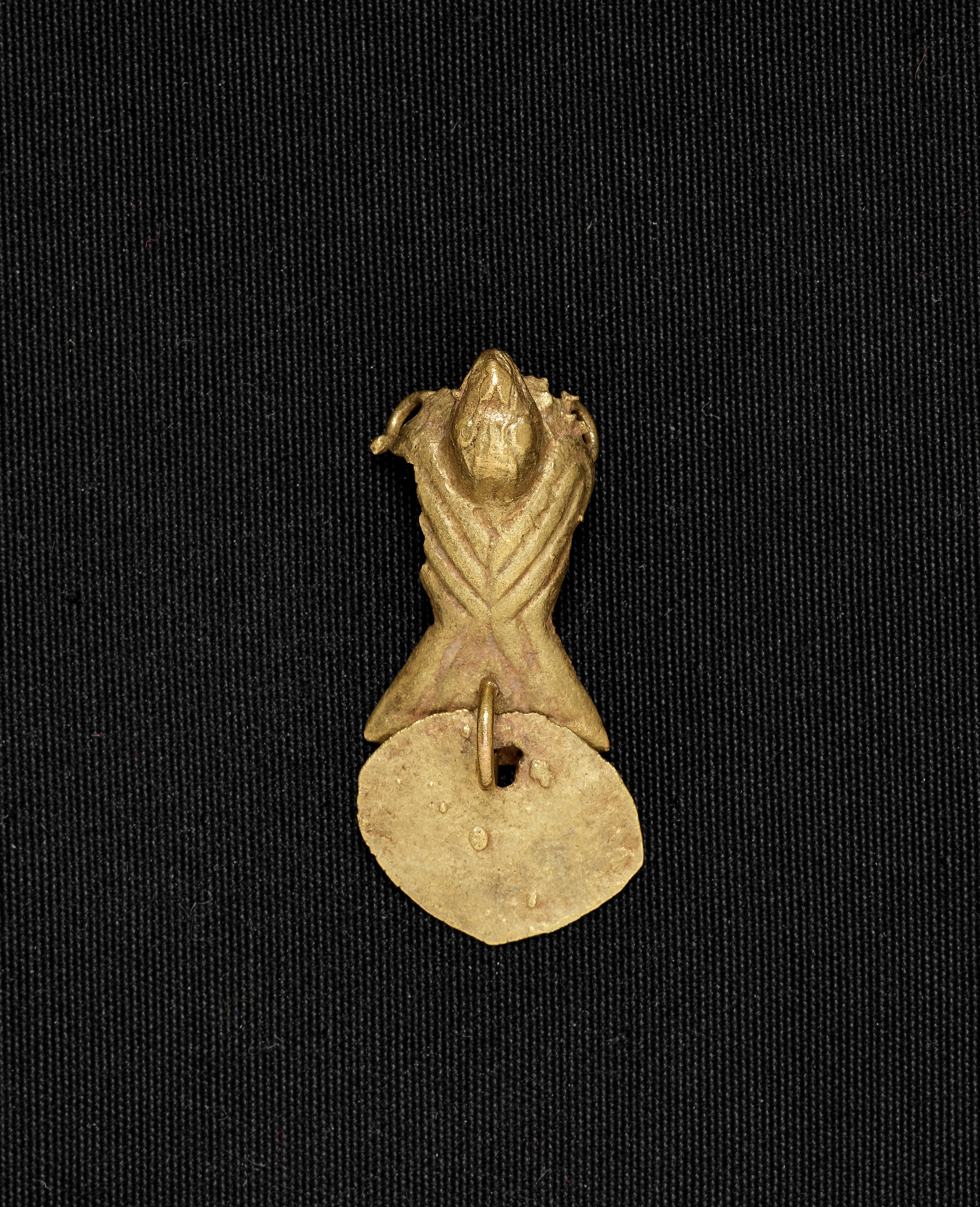 The image shows a brass-colored metal object against a black background. The object is shaped like a bird. The bird's head is at the top and has a pointed beak. Two small holes are on either side of the head. The bird's body is rendered in a chevron pattern. The bottom of the object has a circular shape with a pin. The pin is connected to the object with a small loop. The object is on a black fabric surface. The fabric appears ribbed, possibly from a knit material. The object titled "Bird Bead" appears to be by the artist M.C. Escher.