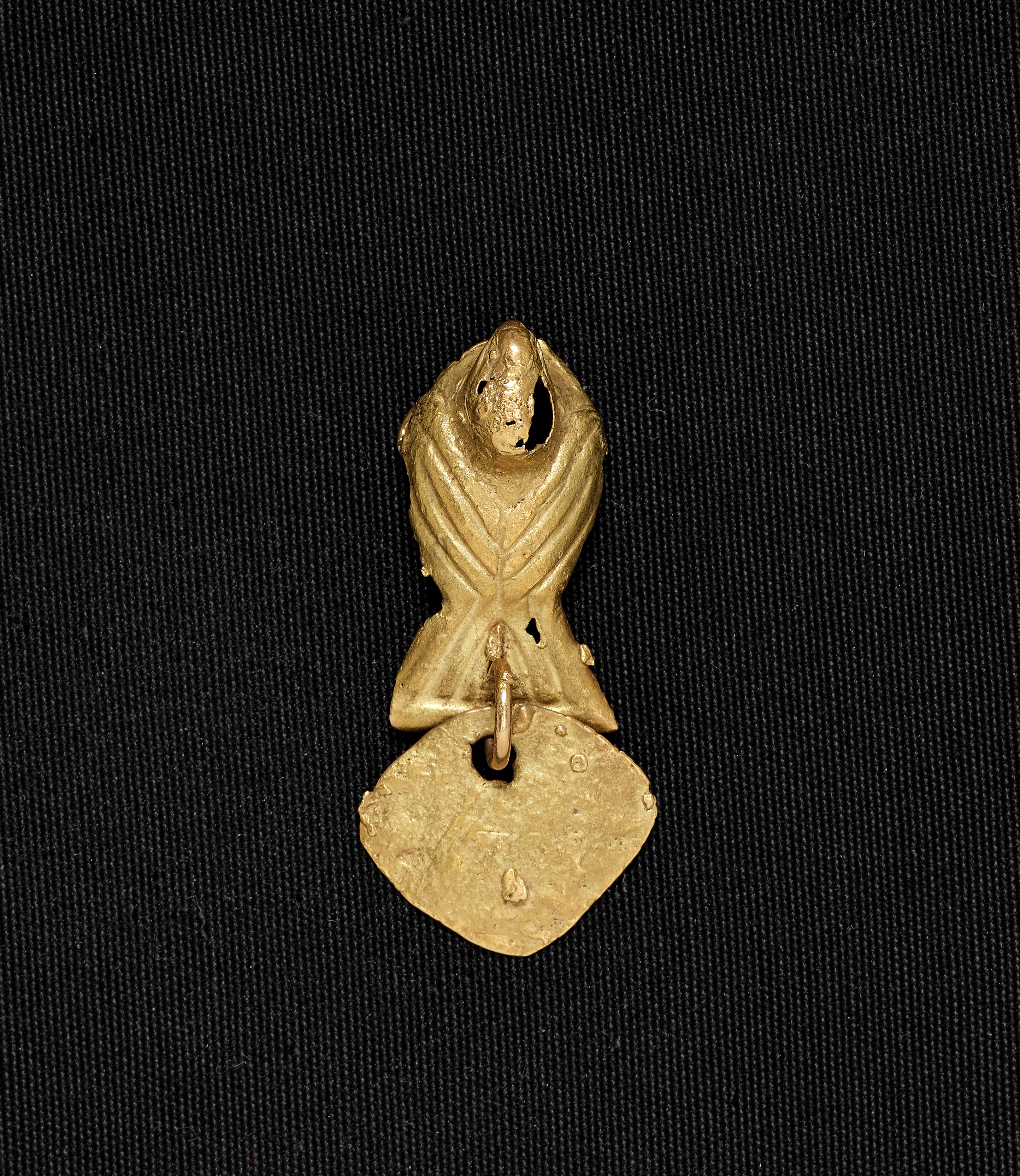 The image shows a gold-colored metal object titled "Bird Bead" by an unknown artist. The object is a small, gold-colored metal bead in the shape of a bird. The bead has a teardrop-shaped top with a small loop at the top, and a larger, irregularly shaped bottom. The bird's body is formed by two curved lines that meet at the bottom of the bead, with a small hole in the center. The bead appears to be made of a gold-colored metal, possibly brass or bronze, and has a rough, textured surface. The background of the image is black fabric.