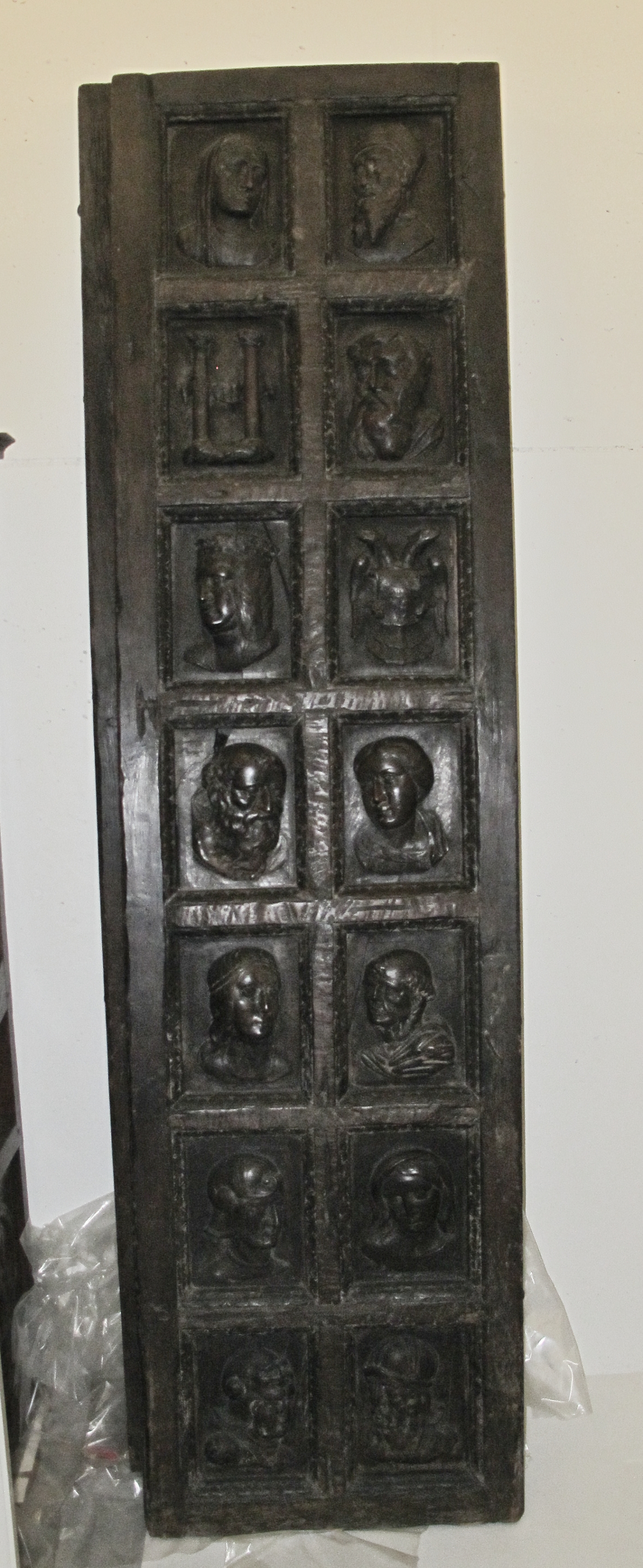 The image titled "Studio Door" by an unknown artist depicts a tall, rectangular, dark gray or black metal door or panel. The door is divided into 12 square sections arranged in four rows of three. Each section contains a raised relief sculpture of a human head or bust, varying in expression and detail. The top row features a veiled woman on the left and a man with a beard on the right, with a damaged or unclear center section. The second row from the top appears to show a capital letter "H" on the left, a sideways-facing profile on the center, and another human bust on the right. The remaining sections display various human busts, with some faces looking right, left, or forward. The reliefs exhibit signs of wear, with darker patina in recessed areas. The panel leans against a white wall, with a clear plastic sheet visible underneath on the left side.